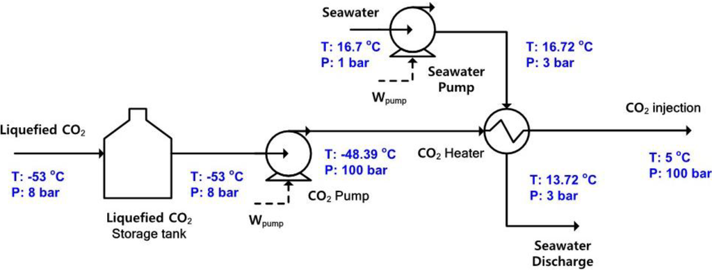 Figure 1 shows a process-flow diagram for a conventional injection system employing seawater in the heating system. Liquefied CO2 is stored in a storage tank on the CO2 carrier at a condition near the triple point, 5.2 bar and −57 °C. First, a pump pressurizes the CO2 pressure to a target pressure. After pressurization, the CO2 is heated with sea water. Finally, the pressurized and warmed CO2 is injected into a geological formation. The stream data presented in Figure 1 is the case assumed in this study.