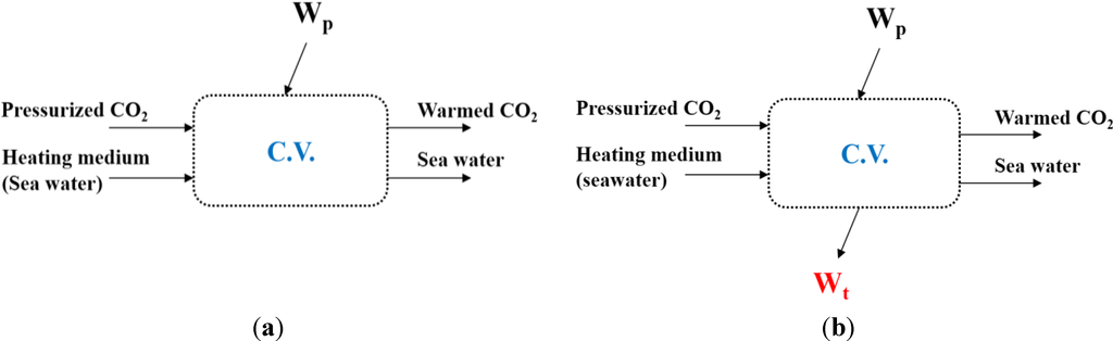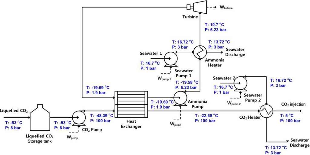 An injection system injects CO2 into a geological storage site and consists of a pressurization and heating process to prevent operational problems [5,6,7]. In the heating process, the temperature of the CO2 is increased by a heating medium, and the CO2 releases its cold energy into the medium; seawater is typically employed as the heating medium in offshore installations or power plants located close to the open sea [8]. The energy from the difference between the temperature of the freezing source and the environmental temperature is called cold energy, and this cold energy is wasted during the heating process in the conventional injection system.