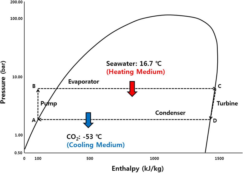 The Rankine cycle generates electrical power and comprises four processes: heat absorption, expansion, heat discharge, and compression. As shown in Figure 3, the pressure-enthalpy diagram of ammonia explains a sequential process in the Rankine cycle. First, the working fluid is vaporized by absorbing the heat from the seawater to force vapor to enter into a turbine (B→C). After vaporization, the working fluid expands through the turbine, thereby reducing the pressure and the temperature (C→D). In this process, electrical power is produced. This electrical power represents the difference in the enthalpy between points C and D. The exhausted working fluid is condensed from the cold energy received from the CO2 liquid (D→A) and is pressurized (A→B).