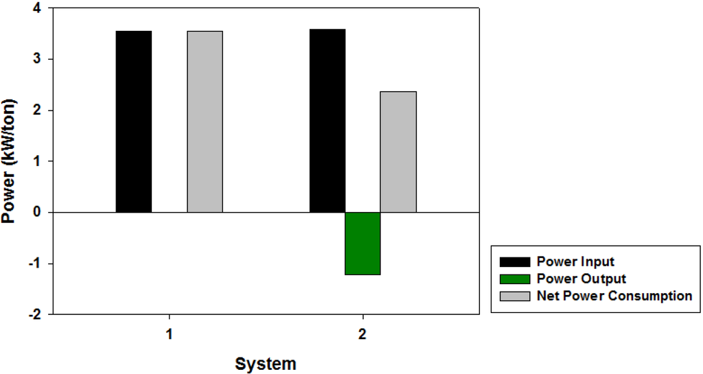 Specific net power consumed in a system is an appropriate measure for comparison. The specific power ( is defined as work divided by unit mass (ton):