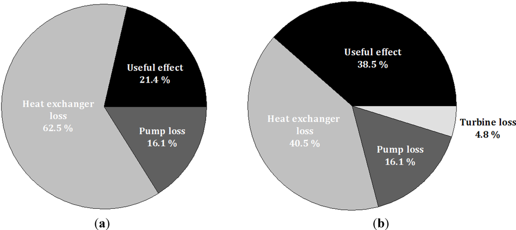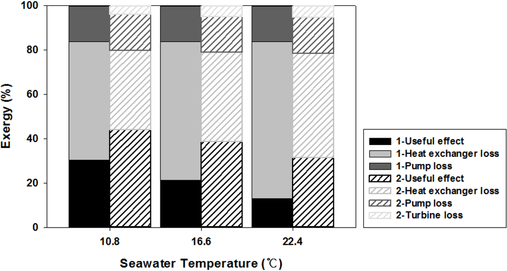 To determine the performance of each system, the exergy efficiency was analyzed. The useful effect of system 2 was found to be 17.1% higher than that of system 1, as shown in Figure 6. The reason for the higher exergy efficiency of system 2 is the reduced exergy loss and the produced work from the turbine. The additional exergy loss occurs at the turbine and the pump, as this system has more processing facilities than system 1. However, the exergy loss of the heat exchanger decreases considerably from 62.5% to 40.5% during the heating of the CO2 with the working fluid before heat exchange occurs with seawater.