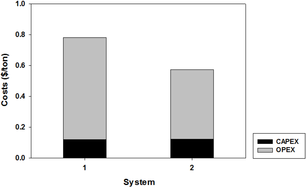 The LCC indicated that the total costs of system 2 were lower than those of system 1, when 1 ton of CO2 was treated. There was a minor gap in the CAPEX between two systems, as shown in Figure 7. As more facilities are installed, the CAPEX increases slightly. However, the OPEX required by each system were considerable, with 0.21 dollars per ton of CO2, which equals costs of to 4.26 million dollars spent over the operating life of the systems.