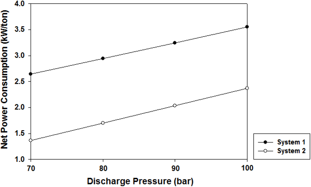 The net power supplied to system 2 is lower than that supplied to system 1, and the difference is the produced power from the Rankine cycle. The net power of system 1 is approximately 2060 kW, and this work is consumed to pressurize the liquid CO2 and seawater. System 2 has a slightly higher power input compared to the system 1. However, the generated work from the Rankine cycle reduced the net power consumption of the system by approximately 706 kW. Figure 5 explains the specific net power of each system required to treat 1 ton of CO2. In system 2, 1.2 kW/ton was saved, and the system used 2.3 kW/ton, while system 1 consumed 3.5 kW/ton.