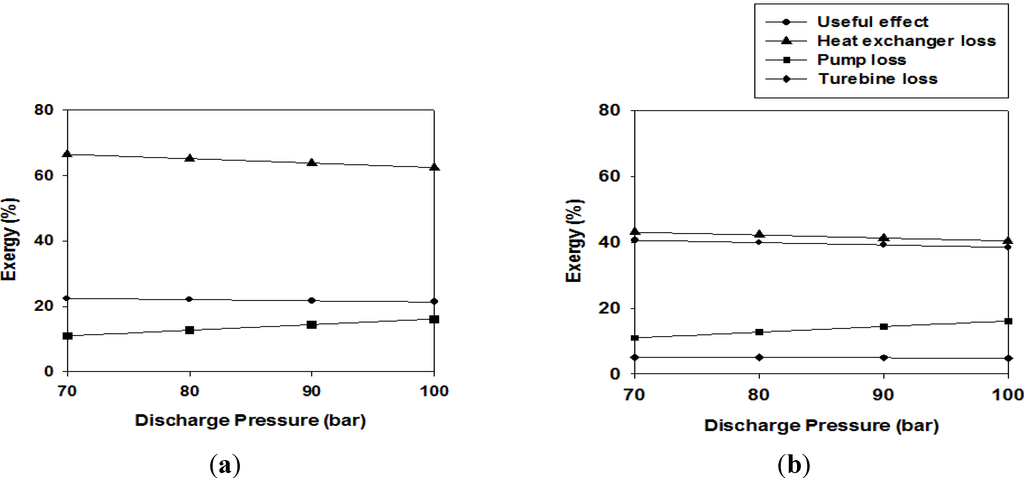 The exergy efficiency decreased slightly, but the efficiency remained consistent across different discharge pressures within a range of 1%, as shown in Figure 9. When the discharge pressure increased, the exergy loss of the heat exchanger decreased, whereas that of the pump was increased. After the pressurization process, the temperature of the CO2 was increased, which helped to reduce the loss at the heat exchanger by minimizing the temperature difference between the heating medium and the cooling medium. Because the loss at the pump was higher than that at the heat exchanger, the exergy efficiency decreased slightly at the higher discharge pressure.