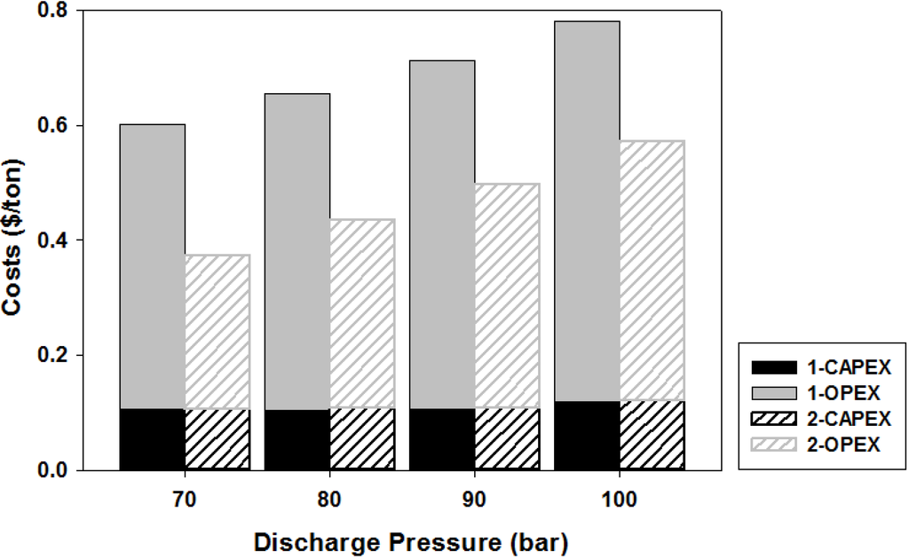 This study performed a sensitivity analysis to analyze the influence of the two main factors that may influence the specific net power consumption, the exergy efficiency, and the LCC: discharge pressure and seawater temperature.