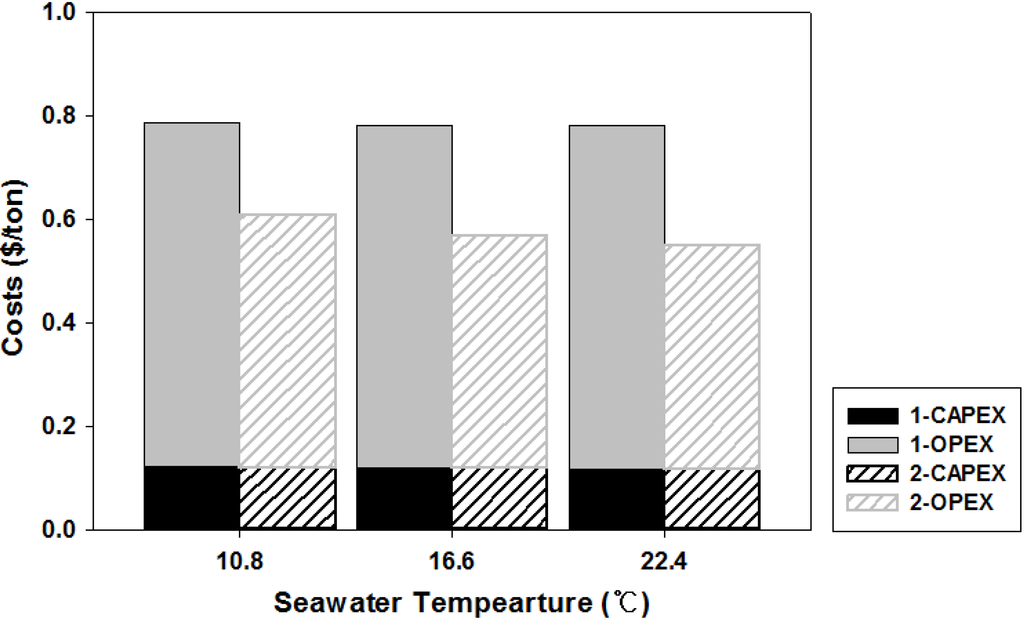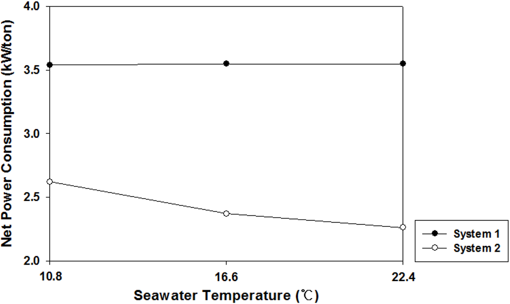 The specific net power consumption of each system at different seawater temperatures is shown in Figure 11. In system 1, the specific net power consumption remained constant, but that of system 2 decreased when the seawater temperature increased. The p-h diagram in Figure 3 explains this relationship between specific net power and seawater temperature. If the seawater temperature is high, then B-C line (evaporating process) moves upward. Therefore, the difference in enthalpy from C to D increases. This gap makes the cycle produce more electrical power.