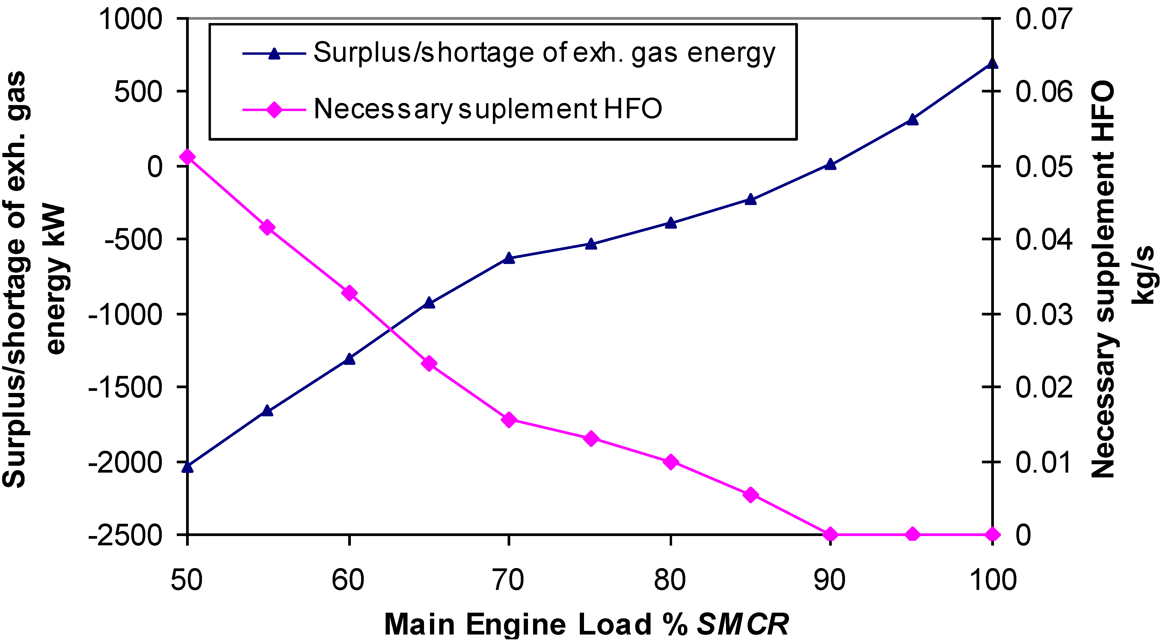 Surplus or shortage of exhaust gas energy, and necessary supplemental HFO at full electrical power are shown on