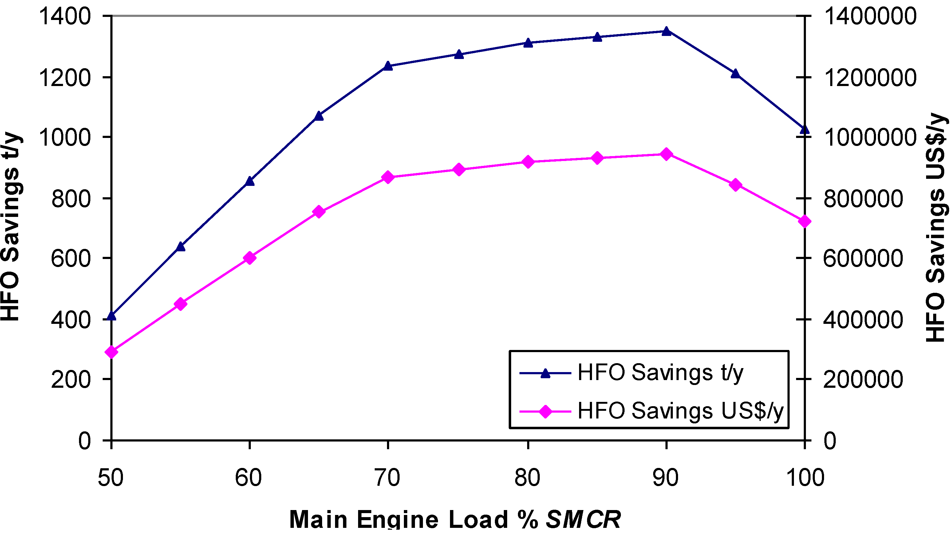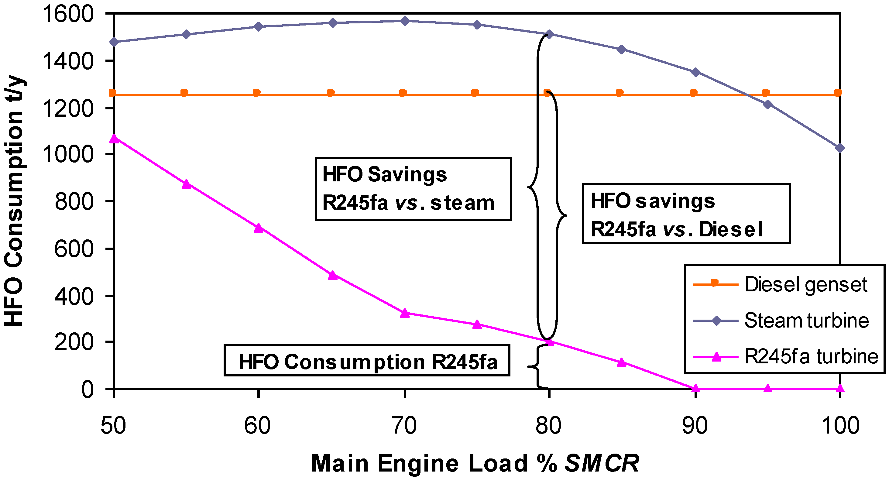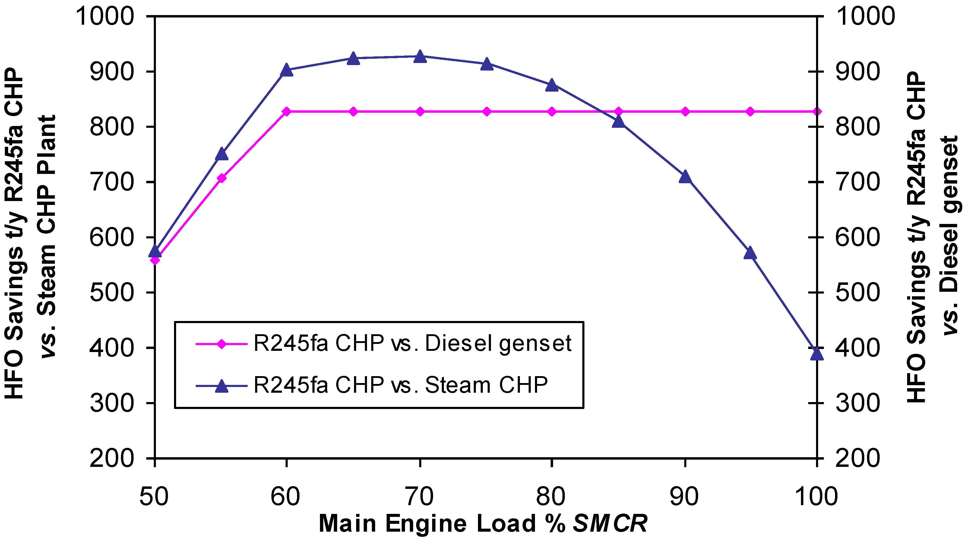 HFO/y. Higher main engine loads should generate higher fuel savings for the R245fa CHP plant.