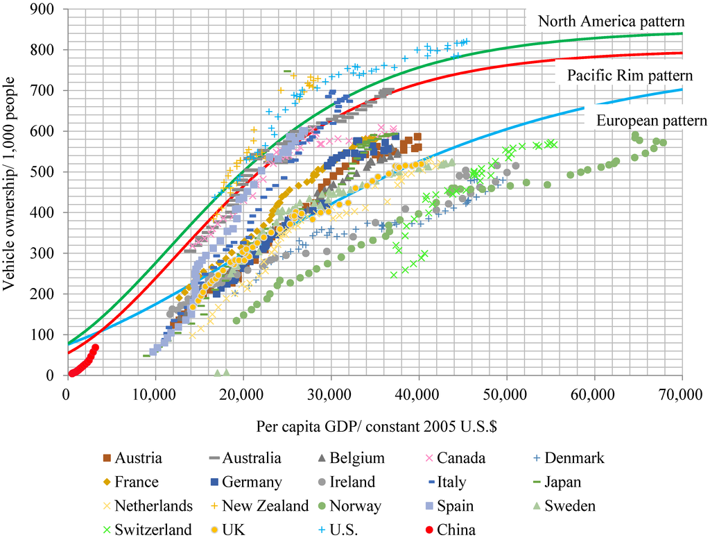 - Wu, T.; Zhao, H.; Ou, X. Vehicle Ownership Analysis Based on GDP per Capita in China: 1963–2050. Sustainability 2014, 6, 4877–4899. [Google Scholar] [CrossRef]