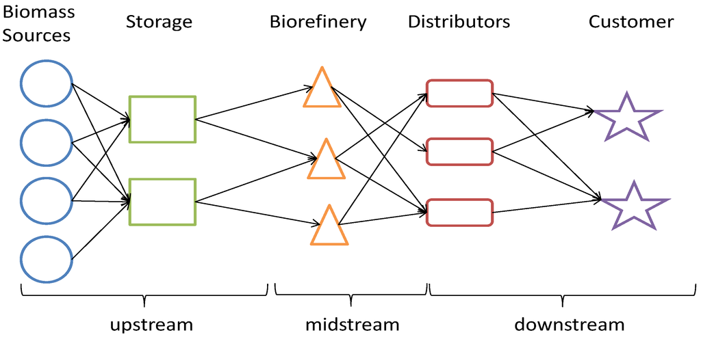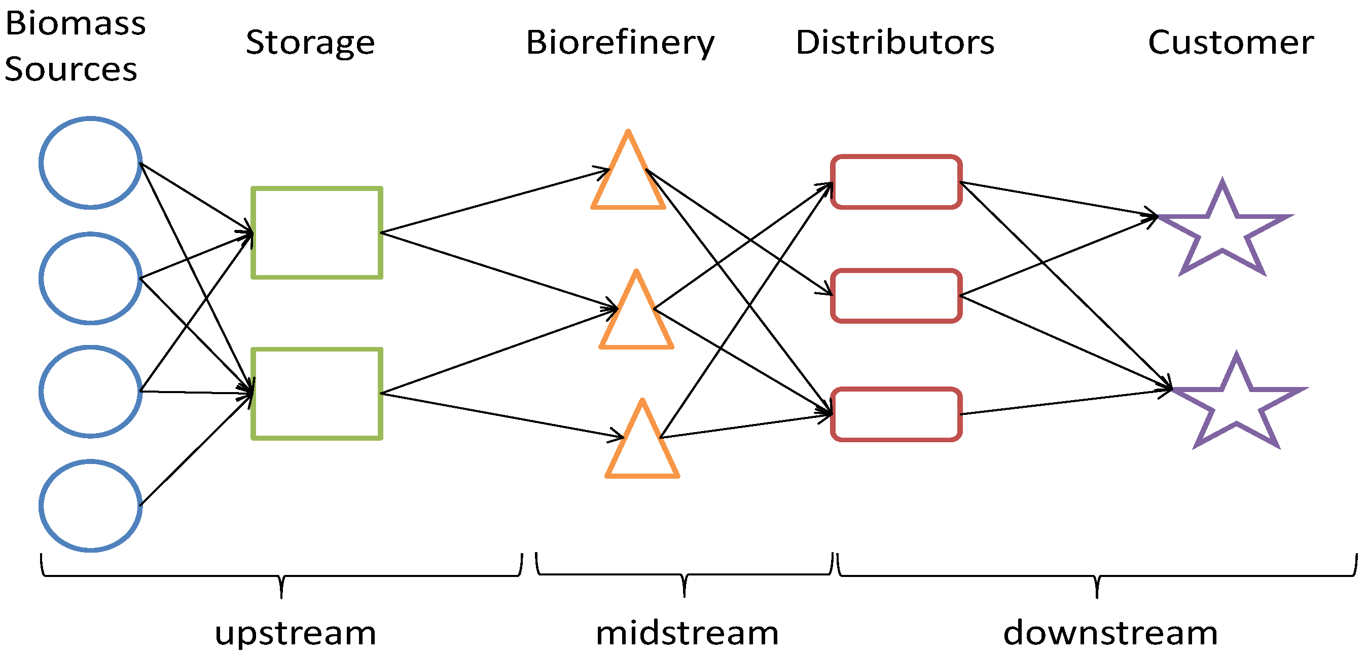 The first classification refers to the decision level and includes the operational timeframe, which refers to hourly and weekly decisions such as vehicle routing and scheduling; the tactical timeframe, which involves monthly decisions such as acres harvested in a time period, biomass inventory/storage policies, biomass processed and transported in a time period; and the strategic timeframe, which comprises multi-annual decisions including supply chain network design, selection/sourcing of biomass type(s) (usually multiple biomass types are needed as shown in [20]), selection of mode of transportation, sustainability issues and location/capacity planning of biomass processing, storage, pretreatment site(s). In addition, upstream, midstream, and downstream are the three primary supply chain levels of supply chain modeling. More precisely, the upstream level includes decisions related to farms, biomass storage facilities and the distribution of biomass to biorefineries; the midstream level includes decisions related to biorefineries location and the conversion process; and the downstream level includes decision regarding the distribution of final product (biofuel or electricity) to the final customer. A generic bioenergy supply chain is illustrated in Figure 1.