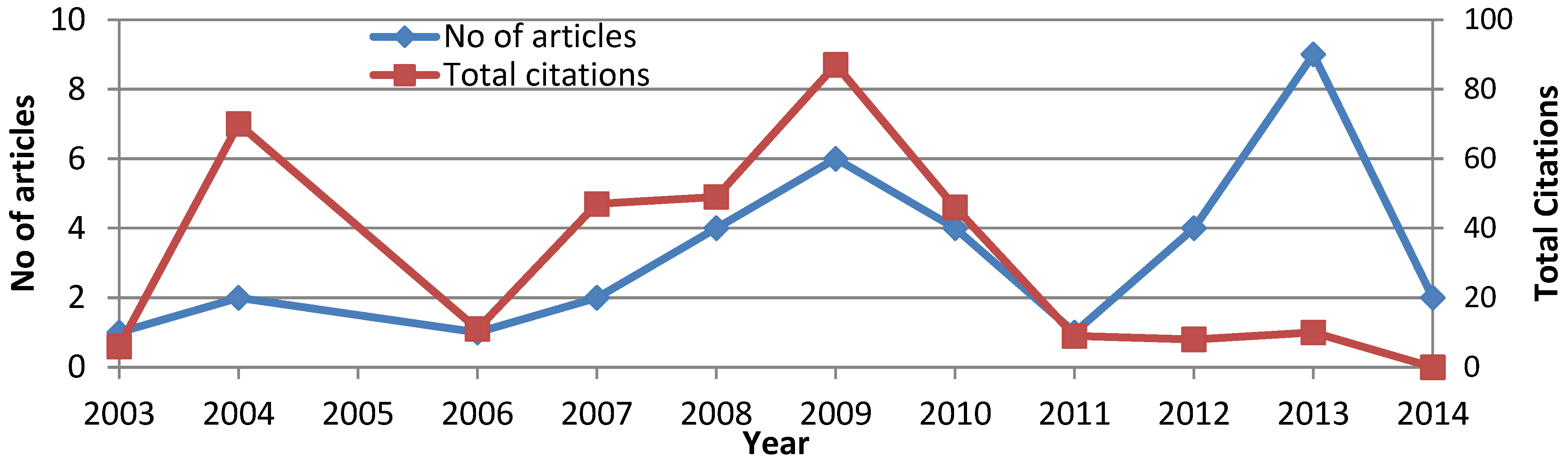 There are thirty one distinct journals in this review and twenty seven of them are recognized by the Thomson Reuter’s databases. Out of twenty seven, Table 4 lists the top six journals in terms of the number of contributions published in this area as well as their impact factors. It can be observed that several articles in the review have been published in high impact journals and have the potential to get more citations in the near future.