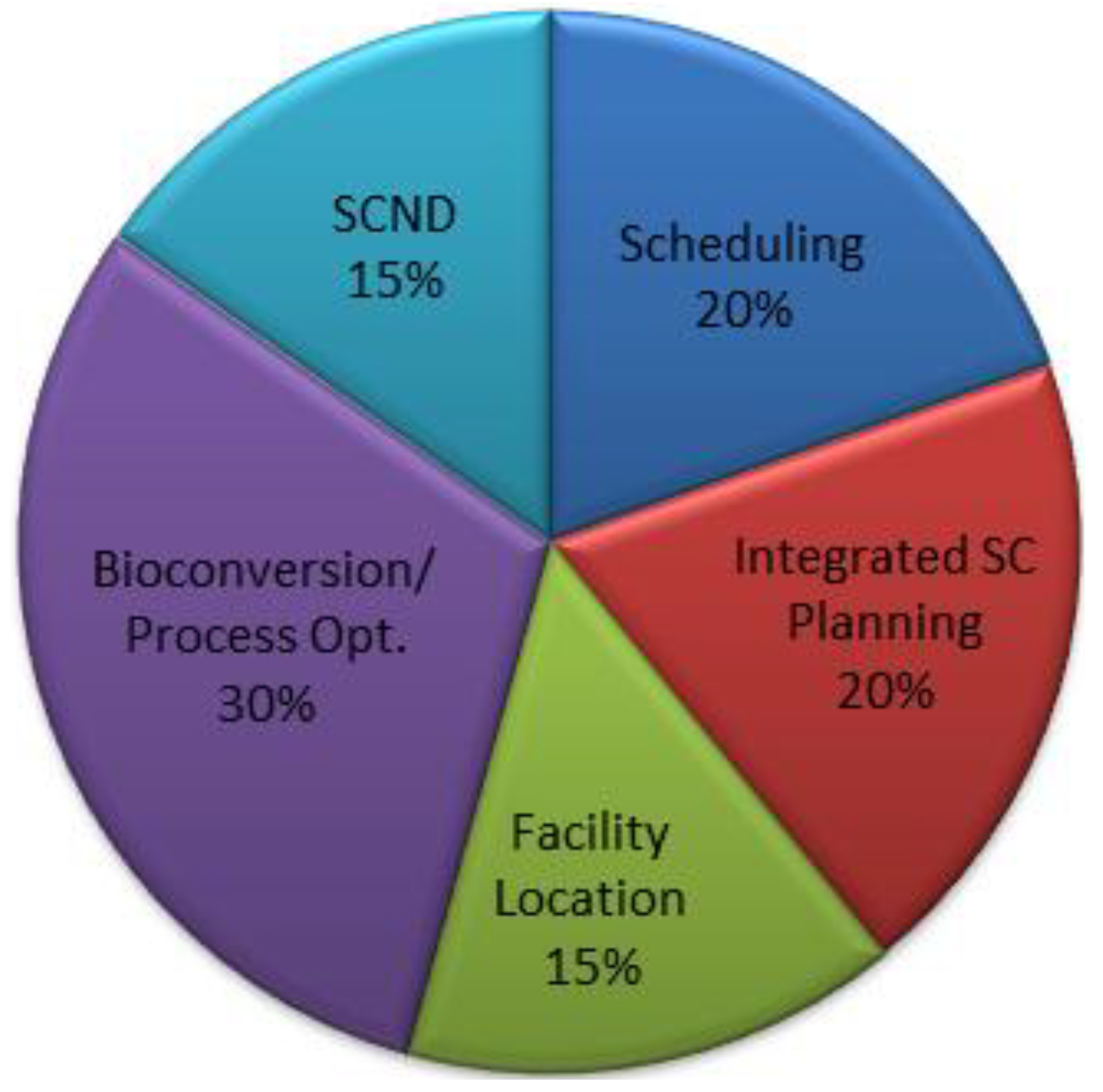 The taxonomy used in this review is based on the specific decision taken at different decision levels, that is, integrated supply chain planning, bioconversion and production process optimization, supply chain network design, scheduling problems, and facility location (refer to Section 4). The common thrust is the application of metaheuristics and hybrid techniques to solve these decisions in bioenergy supply chain decisions. Several supply chain structures, modeling approaches, and performance measures were used by the works reviewed in this review.