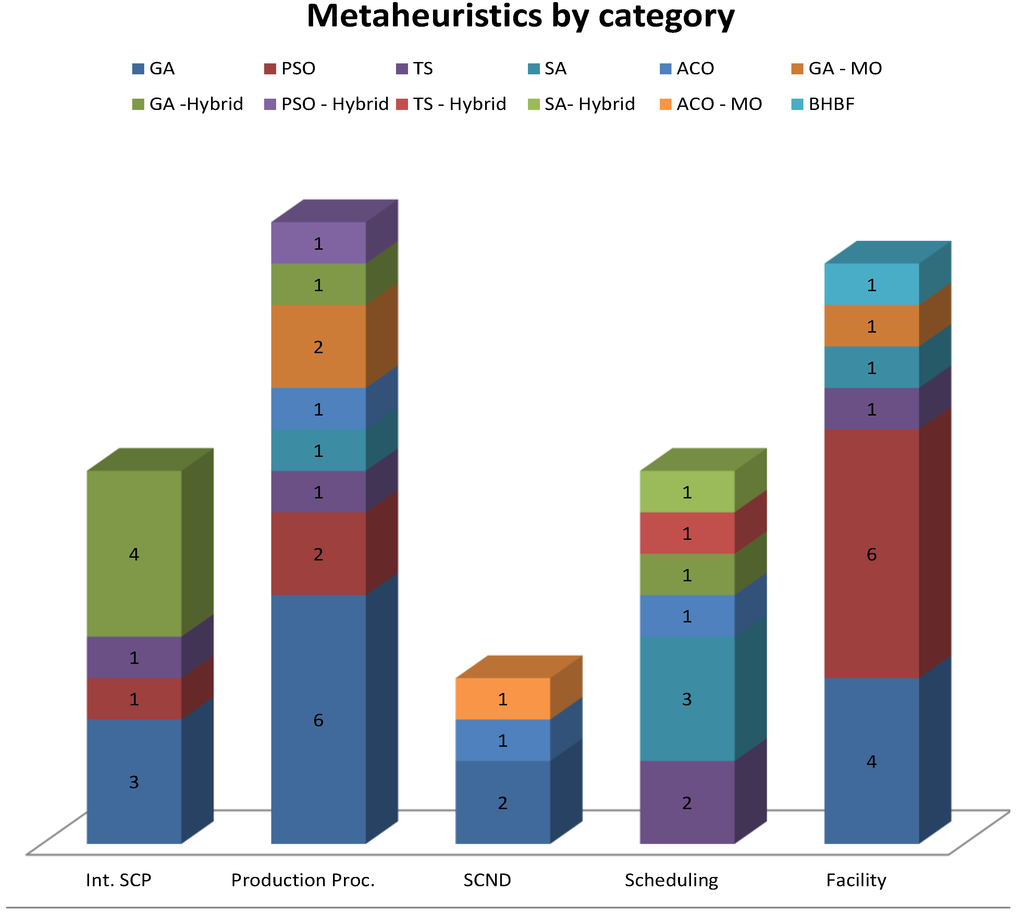 Supply chains can be classified by their mathematical modeling approach. The classification used by Sharma et al. [17] which is taken from [19,22,23] is discussed as follows. The main mathematical modeling approaches used in supply chain are: deterministic, stochastic, hybrid, and IT-driven models. Deterministic models are widely used and these models assume that all parameters and known and fixed in a time period. Deterministic models can be further divided into: single- and multi- objective optimization. Both single- or multi- objective optimization models can be broken into linear, mixed-integer, integer, nonlinear, mixed-integer nonlinear, and integer nonlinear programming. Stochastic (or probabilistic) models involve uncertainty in the input parameters, which follow a probabilistic distribution. Hybrid models combine both deterministic and stochastic models and also include simulation techniques. Metaheuristic optimization techniques (the focus of this review) have proved to be efficient solution procedures for solving stochastic and hybrid models. Finally, IT-driven models integrate real-time application software to enhance coordination, communication, and visualization throughout the supply chain.
