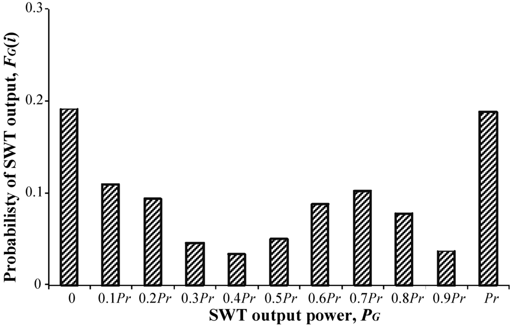 where the SWT output power has states at which the probability of is calculated from the discrete wind speeds and the SWT power output curve. is the probability of SWT output for the th SWT output value, as shown in Figure 1. has been taken as 10 in the figure.