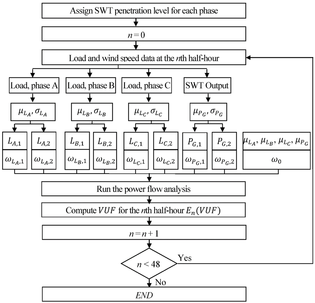 The power flow analysis is carried out adopting a one-day or daily 24-h period with half-an-hour per step. The overall computational procedure for the VU evaluation is depicted in Figure 2. First, the SWT penetration is assigned to each of the three phases prior to a power flow analysis. At the nth half-hour of the day, the four variables (, , and ) are then differentiated into discrete values, and the mean and standard deviation of these variables are calculated. This corresponds to Equations (1)–(6). Thereafter, two points for each of the four variables and the corresponding weighting factors are determined using Equations (9) and (11). These points are assigned to each customer and SWT system in the network accordingly, with which the power flow analyses are carried out. In addition, calculation using the means of all input variables is carried out considering the corresponding weighting factor. In the sequence, the for the nth half-hour is obtained by nine simulation-runs and the calculation using Equation (13). The system repeats this process for every time step until it finishes the simulation for the last half-hour of the day.