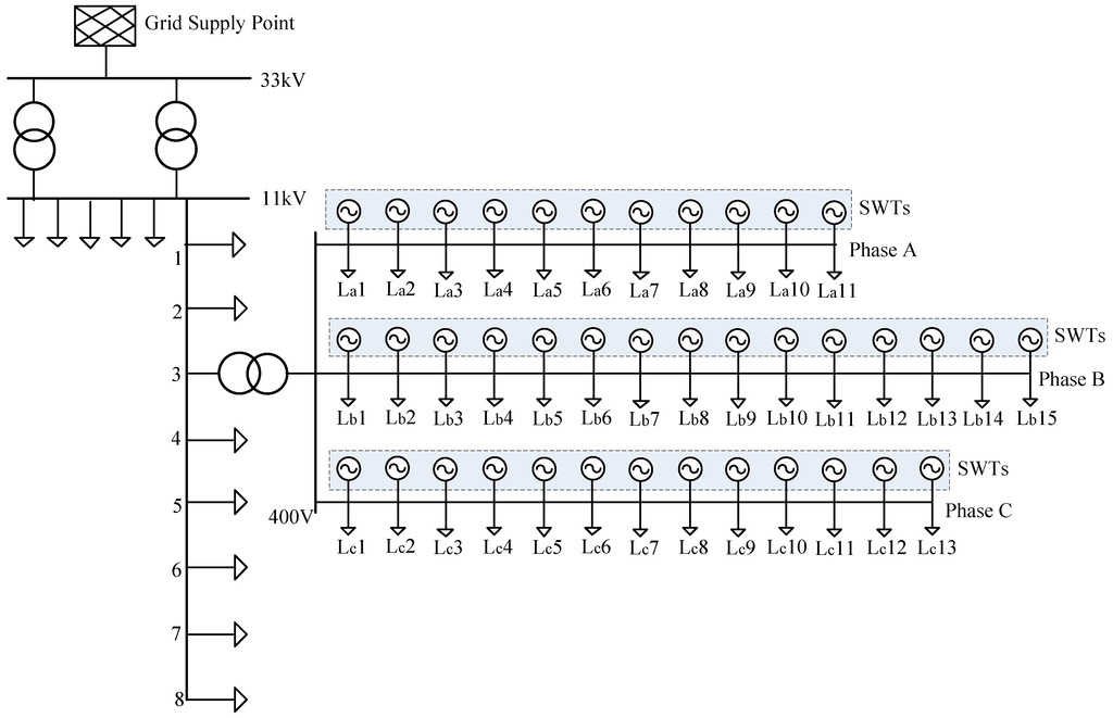 The 33/11 kV network is comprised of six 11 kV radial feeders. Each feeder supplies eight 11 kV/400 V 500 kVA transformers. Five of the 11 kV feeders are modelled as lumped loads, whilst the sixth is presented in details, Figure 3. One of the 400 V sub-networks on the sixth feeder is modified to represent a RDN (with 3-phase 4-wire underground cables). The three-phase nature and single-phase connections of customer loads and SWTs are considered. There are 110, 150 and 130 houses, respectively, in the three phases (i.e., 390 in total), all with a power factor (pf) of 0.98. As shown in Figure 3 each L represents 10 houses. SWTs, rated at 3.5 kVA with a pf of 0.95, are installed in a proportion of the houses. The simulations reported focus on the VU at the secondary of the 11 kV/400 V transformer (e.g., LV busbar) and the nodes along the LV cables.