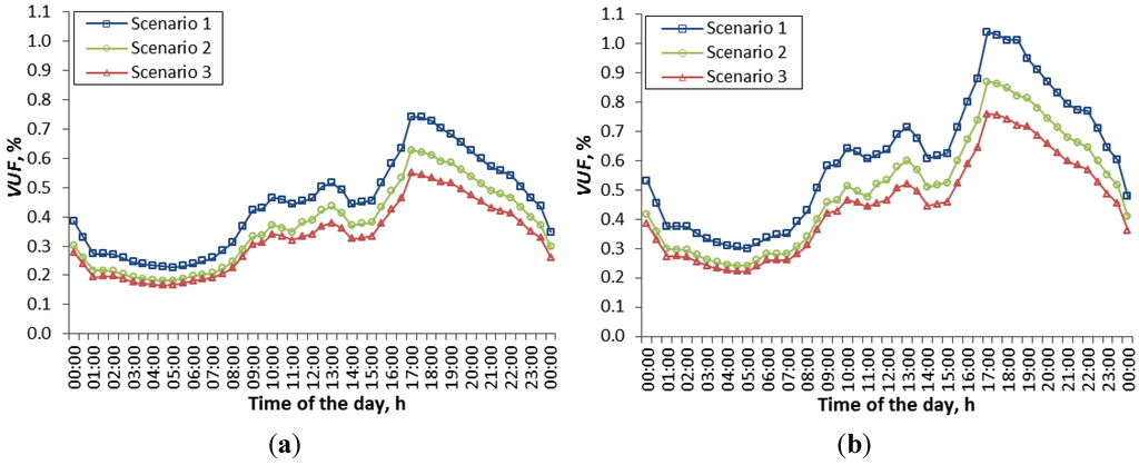 Figure 4a illustrates that, for the cases where SWT penetration is balanced across the three phases (Scenarios 2 and 3), the reduces with increasing penetration of SWTs, compared to Scenario 1 (no SWTs); for the cases with unbalanced distribution of SWTs (Scenarios 4 and 5), the VUFs are higher than in Scenario 1, as shown in Figure 5a, and the VU in Scenario 5 is the worst-case scenario. For each scenario, VUFs at the remote end of the LV cables are shown higher than the LV busbar.