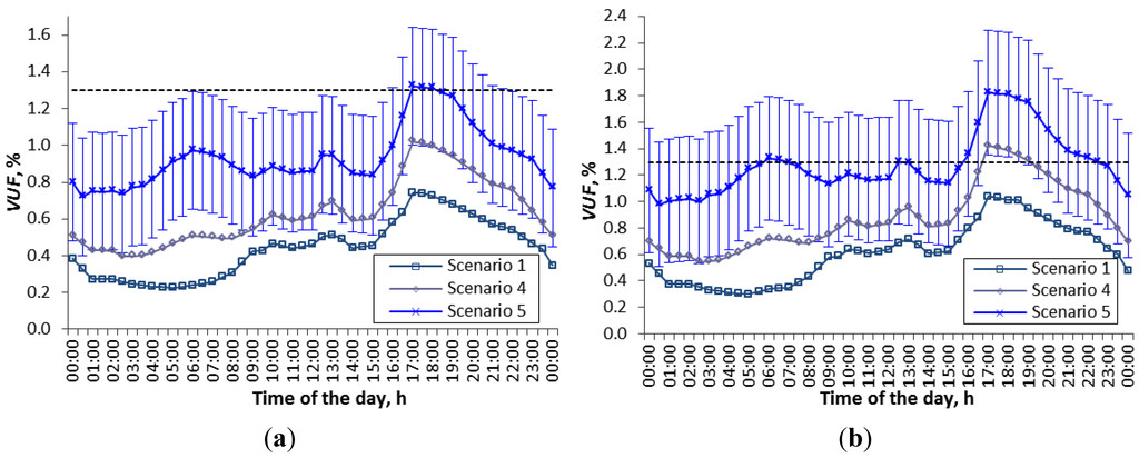 VUFs for unbalanced SWT penetration at: (a) the LV busbar and (b) remote end of the LV cables.