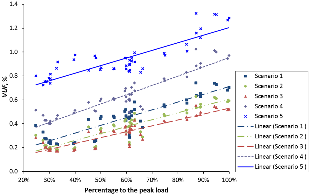 To examine the VU a distribution network experiences at different loading conditions, correlation between the percentage of the peak load and VUFs at the LV busbar were sought. The correlation is represented by a linear trend for each simulated scenario, as illustrated in Figure 6. The trend suggested in Figure 4 and Figure 5, i.e., higher VUF exists for greater unbalance in SWT penetration, is also indicated here and Scenario 5 is shown to be the worst-case scenario among all the scenarios.