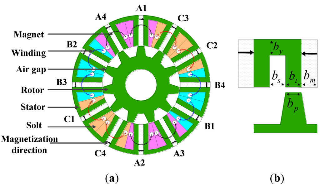 The flux switching permanent magnet (FSPM) machine is a potential candidate for the in-wheel machine. It can generate sufficient torque and power density, especially under starting and climbing conditions [1,2,3]. Its high power density characteristics are similar to those of permanent magnet (PM) machines [4,5,6,7,8]. Both windings and PMs are installed on the stator. This structure can avoid both the influence of centrifugal force on PMs and the problem of PM demagnetization caused by heat dissipation issues. As the waveform of the back electromotive force (EMF) is a sine wave, it is preferable to drive the FSPM machine in the brushless alternating current mode. Magnet accumulation effect is generated by neighboring PMs with opposite directions, which can reduce the volume of the machine, lessen the number of the PMs and decrease the machine cost. Different from common PM machines having PMs and armature windings magnetically in series, FSPM machines having PMs and armature windings magnetically in parallel lead to high flux weak capability, which is suitable for a wide speed range [9,10]. In particular, after hybrid excitation flux-switching machines were proposed, the flux linked in the armature windings per phase can be increased or reduced according to the operational status requests, which makes the magnetic field easily adjusted [11,12,13]. The fault-tolerant capability of FSPM machines has also been a hot topic in recent years, FSPM machines with fault-tolerant capability can continue to operate under open circuit and short circuit fault conditions [14,15,16,17]. To sum up, because of the FSPM machine’s simple structure, good controllability, high power density and fault-tolerant performance, it is a good selection for driving EVs.