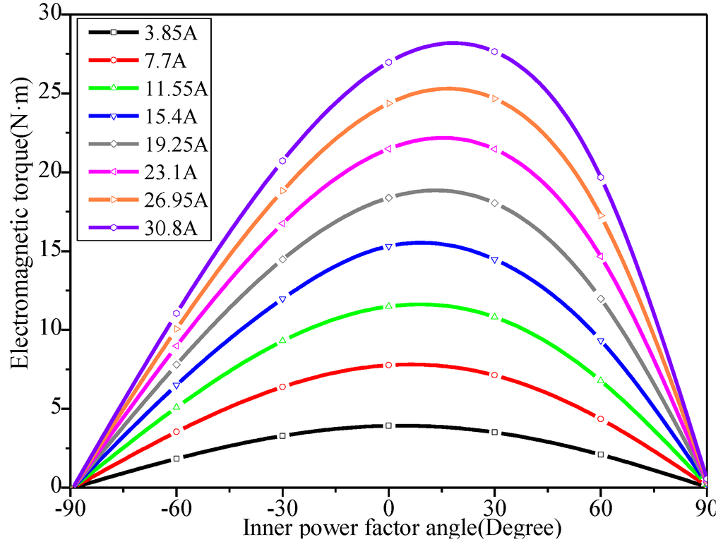 The torque curves of the FSPM machine excited with various current amplitudes (3.85–30.8 A) and inner power factor angles (−90°–90°) are shown in Figure 2.