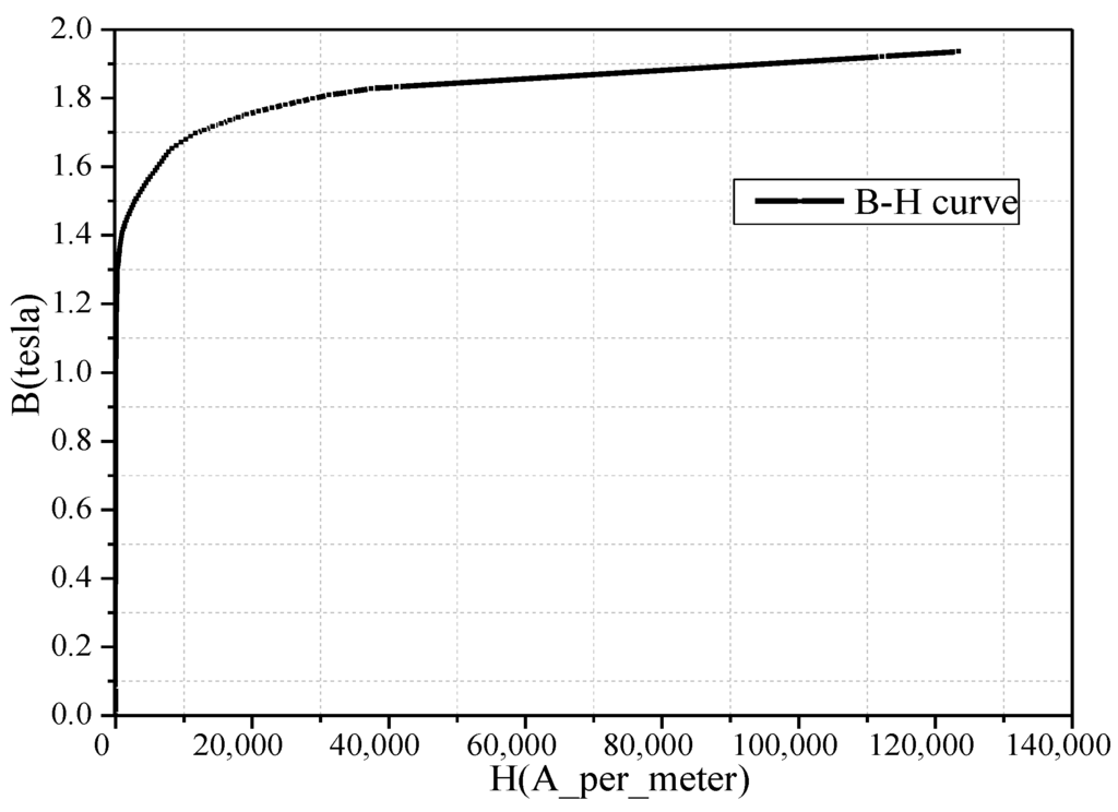 The B-H curve of the iron core is shown in Figure 3. It can be seen that the torque growth rate is less than the current growth rate due to the saturation of the iron core. The torque reaches its maximum value at around inner power factor angle of 15°.