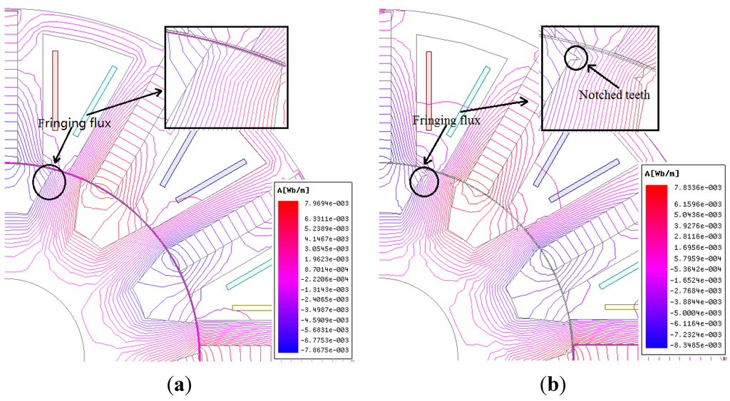 Due to the serious partial saturation, a comparatively large torque ripple will be caused by the fringing flux before the stator teeth and the rotor teeth begin overlapping. Figure 4a shows the flux distribution of the initial structure. In order to reduce the fringing flux, this part puts forward a new notched teeth shape. Different from notched teeth at the top of stator or rotor teeth in [16], the proposed notched teeth shape is with v-shape notches on both sides of the rotor teeth. Figure 4b shows the flux distribution of rotor with notched teeth.