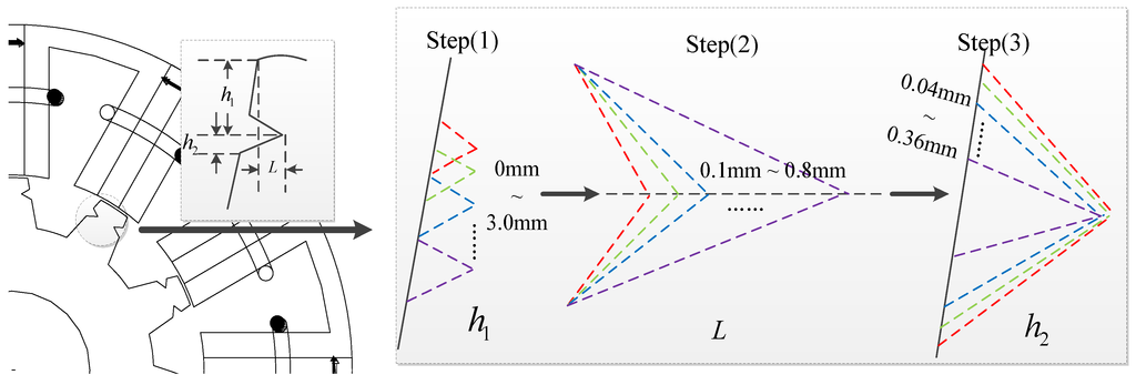 Modifications were performed by changing the shape and position of the v-shape notch to obtain better torque characteristics. The ranges of the main dimensions, i.e., the height of the v-shape notch vertex h1, the depth of v-shape notch L, the width of v-shape notch h2, are shown in Figure 5. Considering that the teeth top has a great influence on the cogging torque, the notch position should not be too far from the teeth top, so the parameter h1 is selected from 0 mm to 3.0 mm. In addition, as the notches are on the sides of the teeth, the depth and width of the v-shape notch influence the magnetic reluctance directly. Thus, the depth L and width h2 of the v-shape notch should be small in order to obtain higher average torque. In this paper, L is selected from 0.1 mm to 0.8 mm, and h2 is selected from 0.04 mm to 0.36 mm.