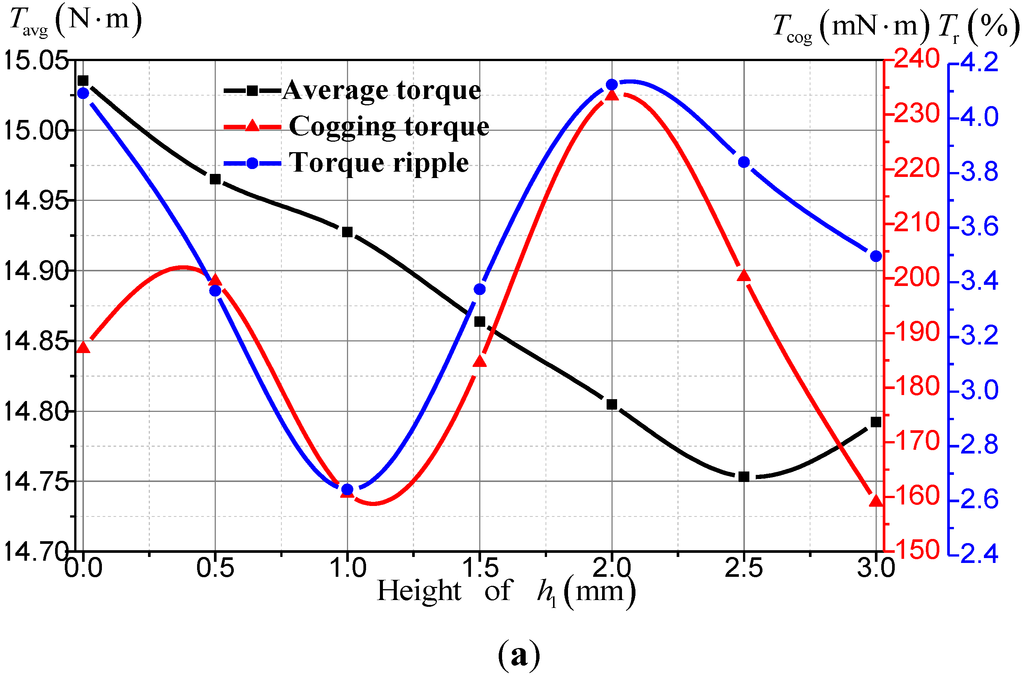 The changing laws of average electromagnetic torque, cogging torque and torque ripple with the variation of parameters are shown in Figure 14. It should be noted that the data of point h1 = 0 mm, in Figure 14a represents the torque data with only the eccentric teeth and without notched teeth.