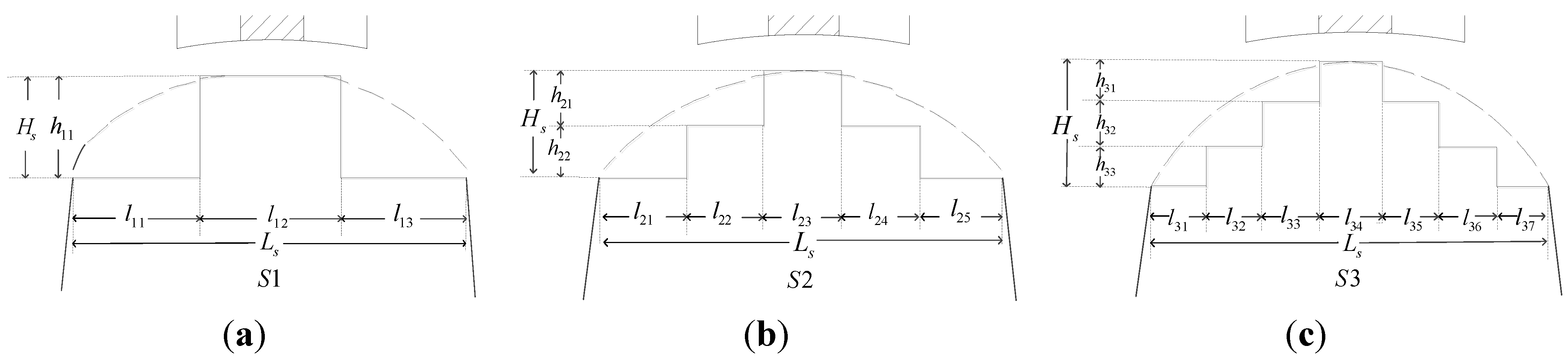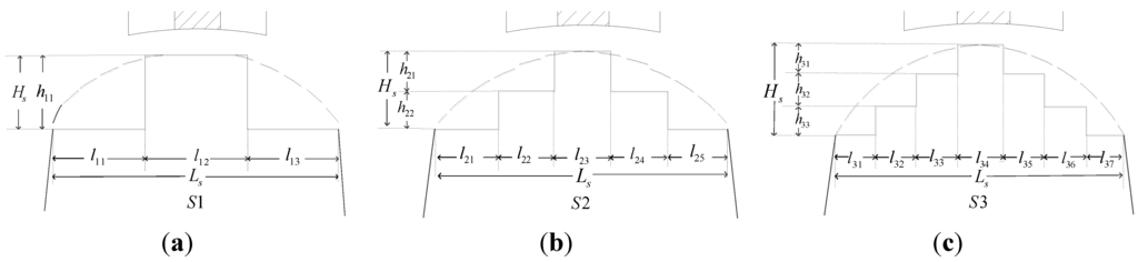 Stepped teeth schemes and design variables: (a) S1; (b) S2; and (c) S3.