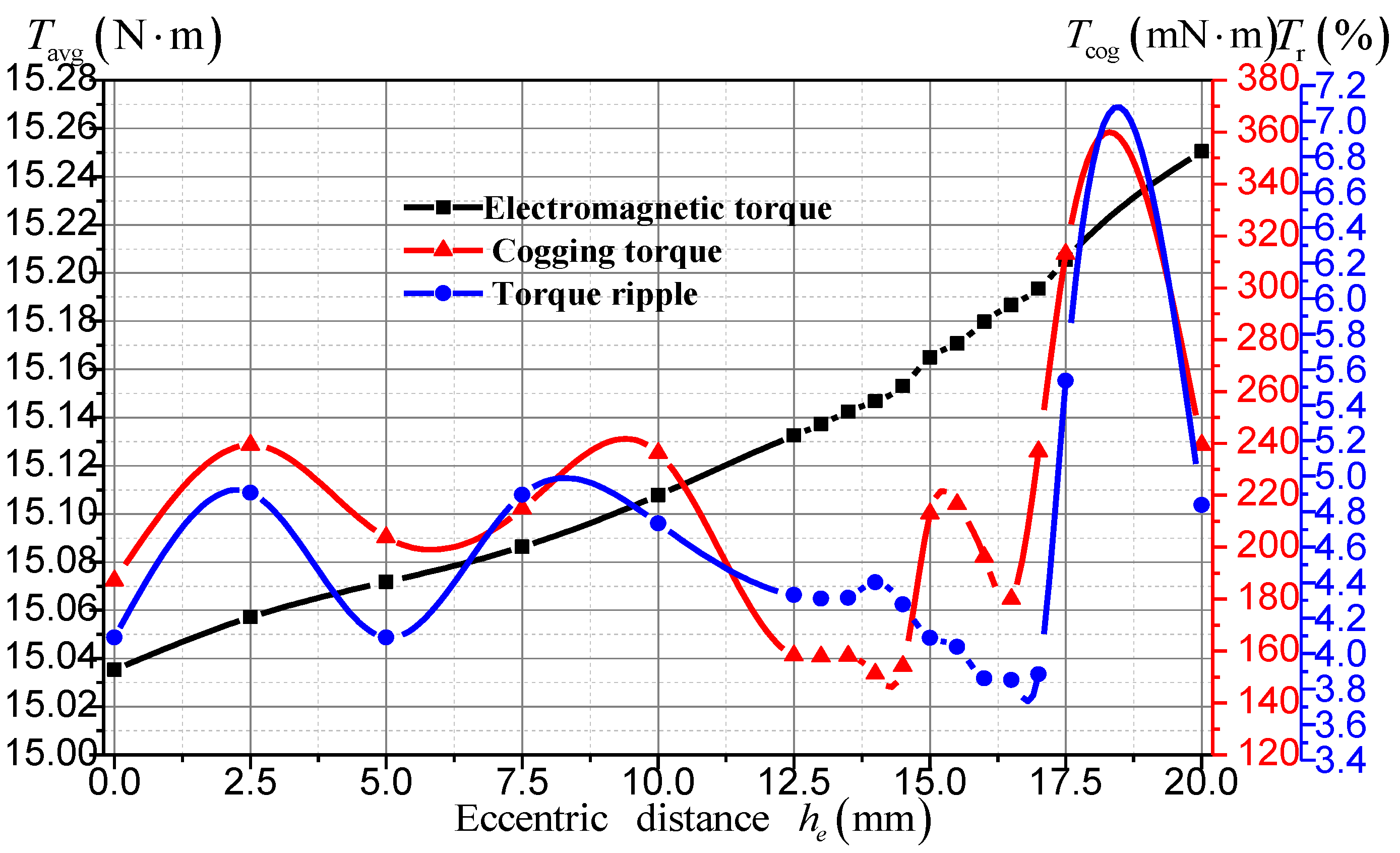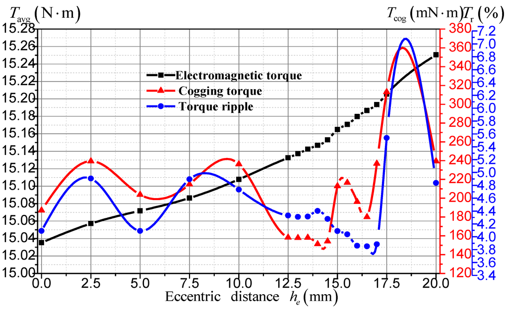 In this paper, the eccentric distance varies from 0 mm to 20 mm at an interval of 2.5 mm firstly. It is found that the cogging torque and torque ripple are low in the range of 12.5–17.5 mm. Then, a more detailed interval of 0.5 mm is adopted in the range of 12.5–17.5 mm for further research. The results are shown in Figure 10. The torque ripple reaches its minimum value at he = 16.5 mm. With the increase of eccentric distance, the electromagnetic torque keeps increasing, while the torque ripple firstly decreases and then increases, and the cogging torque firstly increases, then decreases and finally increases again.