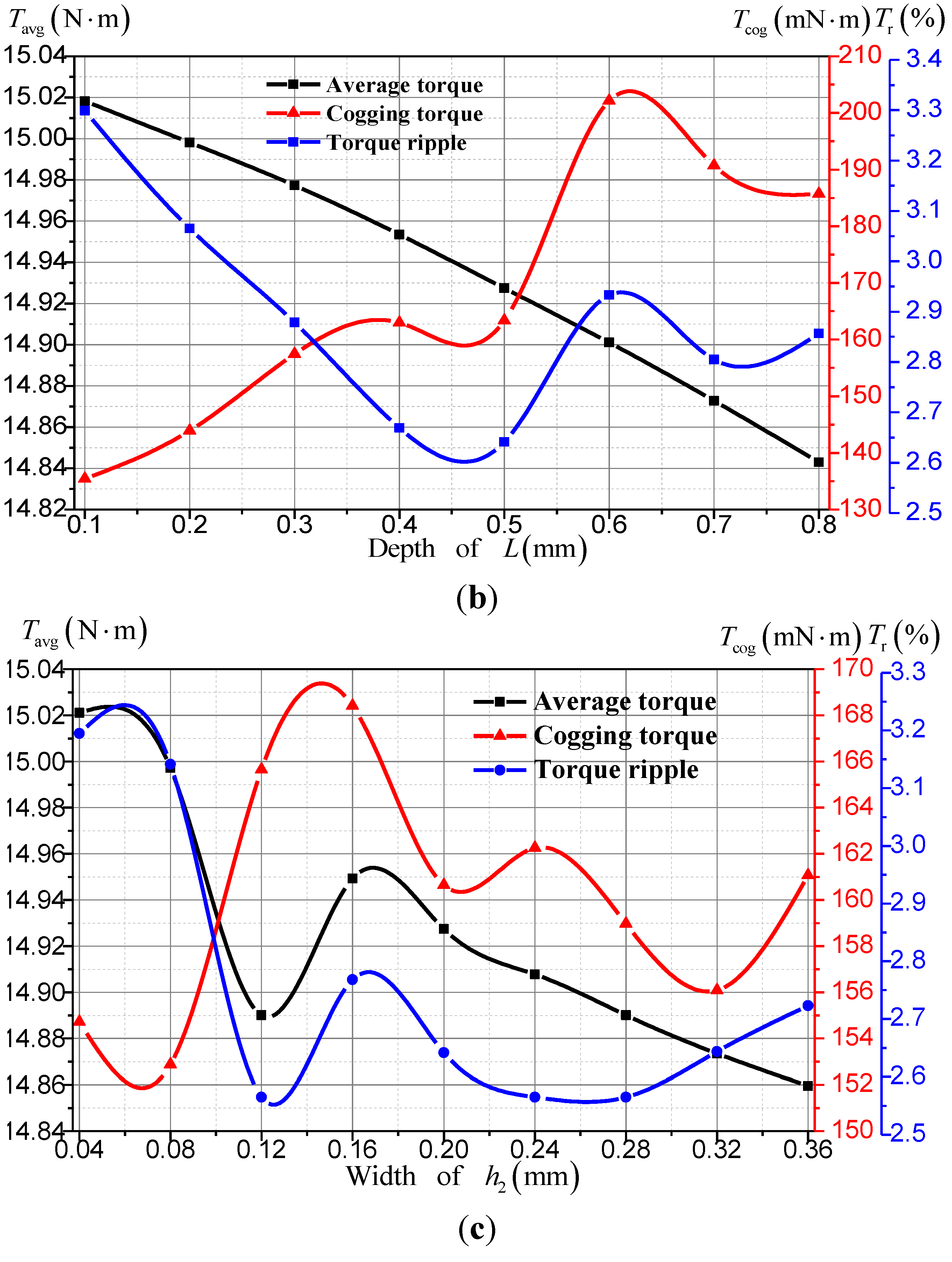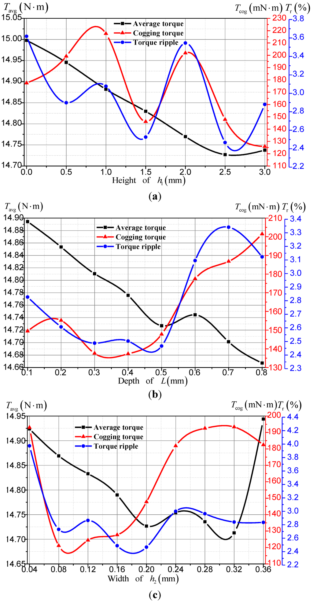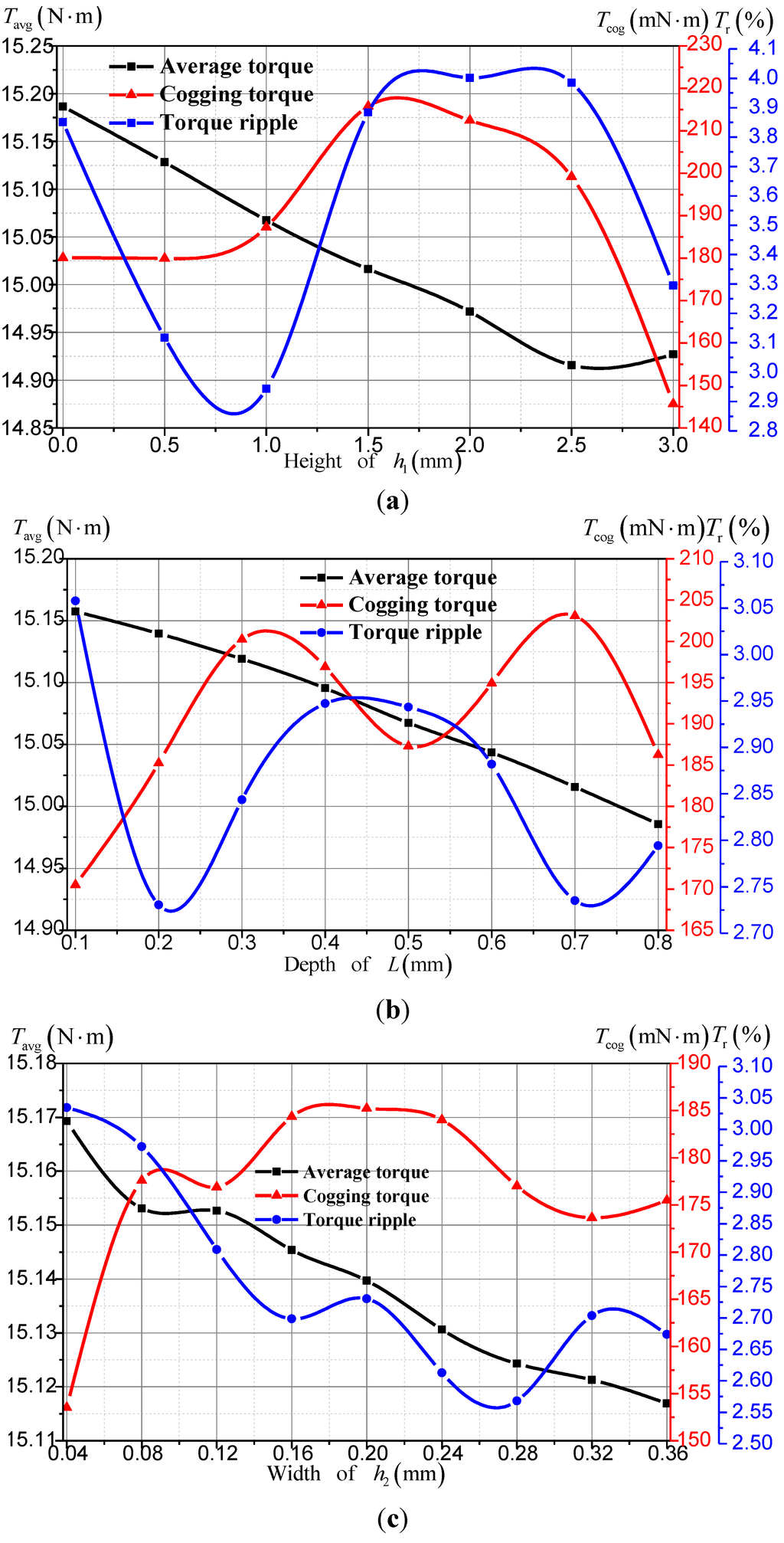 Average torques, torque ripples, cogging torques according to: (a) the height of h1; (b) the depth of L; and (c) the width of h2.