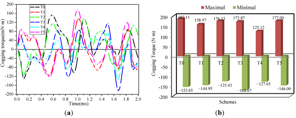The cogging torques of different schemes are plotted in Figure 15a, while the maximal and minimal values of the cogging torque are given in Figure 15b. The scheme T4 of the combination of stepped and notched teeth has the lowest cogging torque 127.65 mN·m, followed by the T1 with 158.97 mN·m, T3 with 172.87 mN·m, T2 with 176.13 mN·m, T5 with 177.00 mN·m, while the initial structure T0 with the largest cogging torque 187.11 mN·m.
