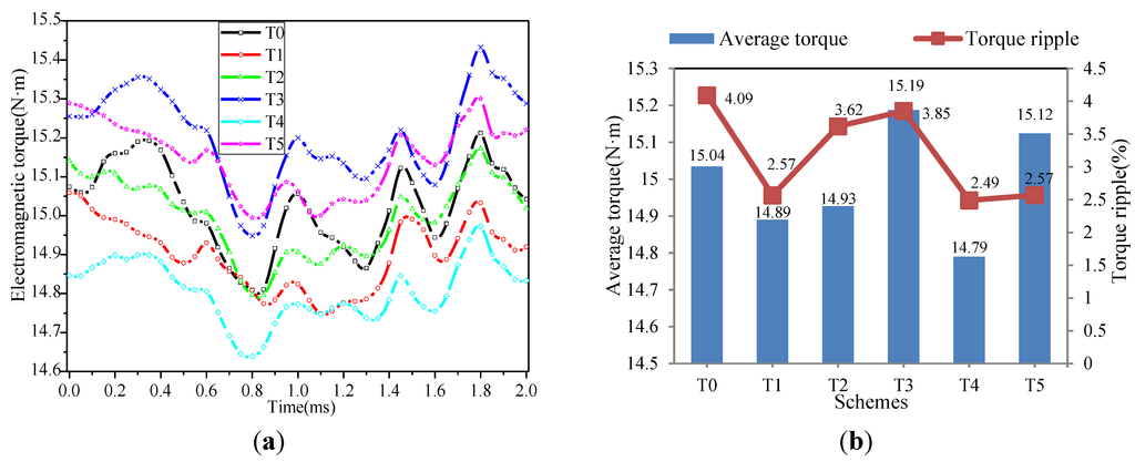 The electromagnetic torques of machines with different rotor teeth shapes at 600 rpm excited by 15.4 A current are given in Figure 16a. The statistics on average electromagnetic torques and torque ripples are summarized in Figure 16b. As shown in Figure 16b, the schemes of T3 and T5 have higher electromagnetic torque than the other four schemes due to their smaller air-gap lengths. On the contrary, the schemes of T1, T4 and T5 have better suppression effect on the torque ripple while the electromagnetic torques change little.