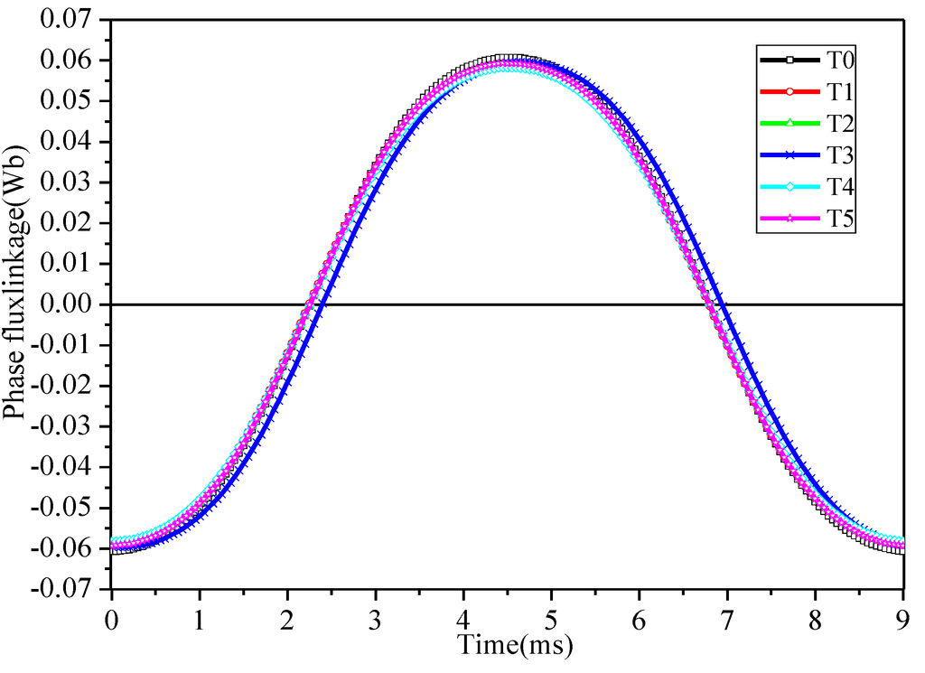 The curves of phase-A flux linkage of air-gap excited by the PM are shown in Figure 17. The amplitudes of flux linkage with different rotor teeth shapes are different because the equivalent magnetic resistances of different rotor teeth shapes are varied slightly.