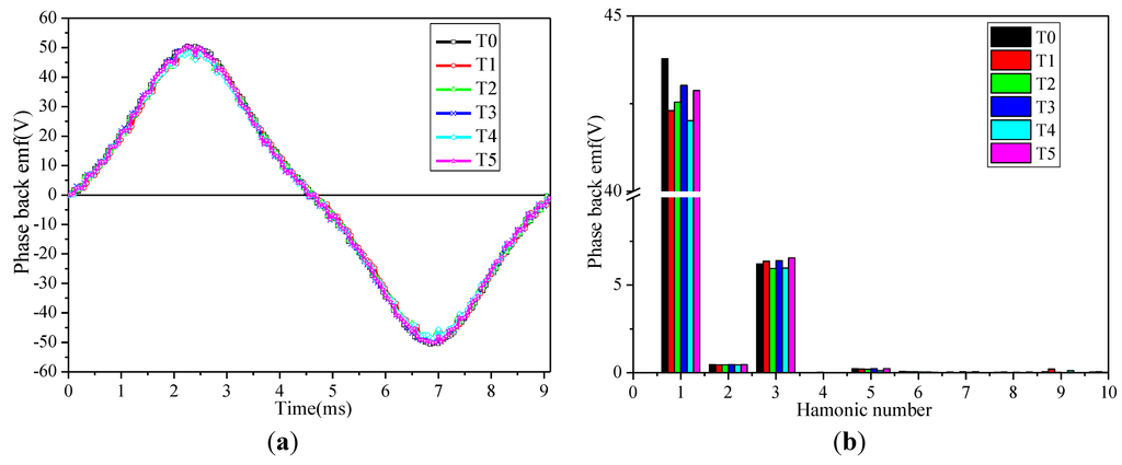 According to Equation (4) [4], the THD of the initial structure is 14.24%, after adopting the novel schemes, the THD are 15.09% in T1, 14.02% in T2, 14.90% in T3, 14.25% in T4 and 15.32% in T5, respectively. The rotor with stepped teeth scheme T2 has the best sinusoidal back EMF. As illustrated in Figure 18b, all schemes exhibit higher third harmonic, which can be eliminated by taking advantage of the Y type connection winding of the FSPM machine. Omitting the third harmonic, the harmonic proportions of each scheme are significantly reduced to 1.23% in T0, 1.33% in T1, 1.18% in T2, 1.24% in T3, 1.19% in T4 and 1.24% in T5, respectively. By comparison, the rotor with stepped teeth scheme T2 still has the best sinusoidal back EMF waveform.
