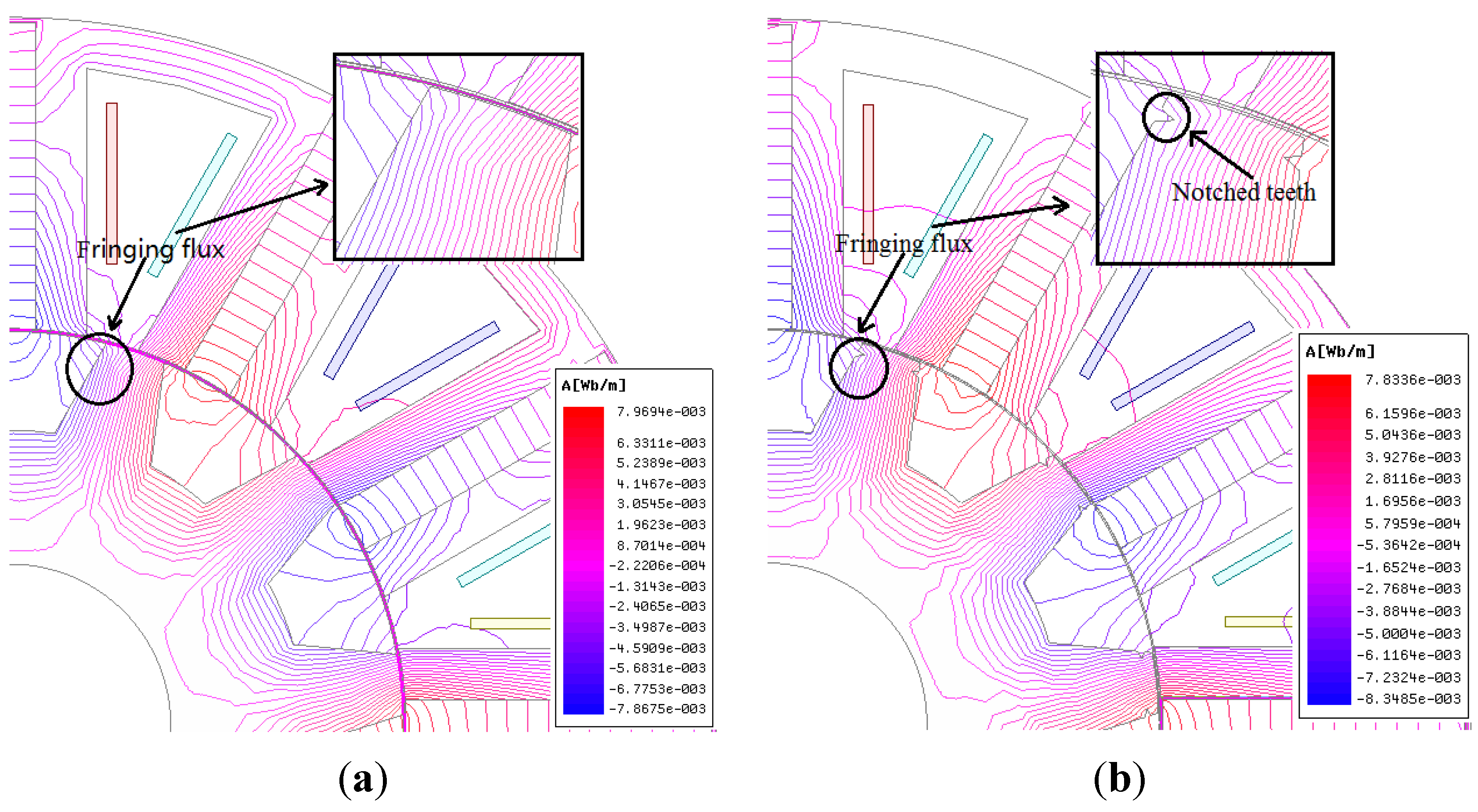 The flux distribution: (a) initial model; and (b) rotor with notched teeth model.
