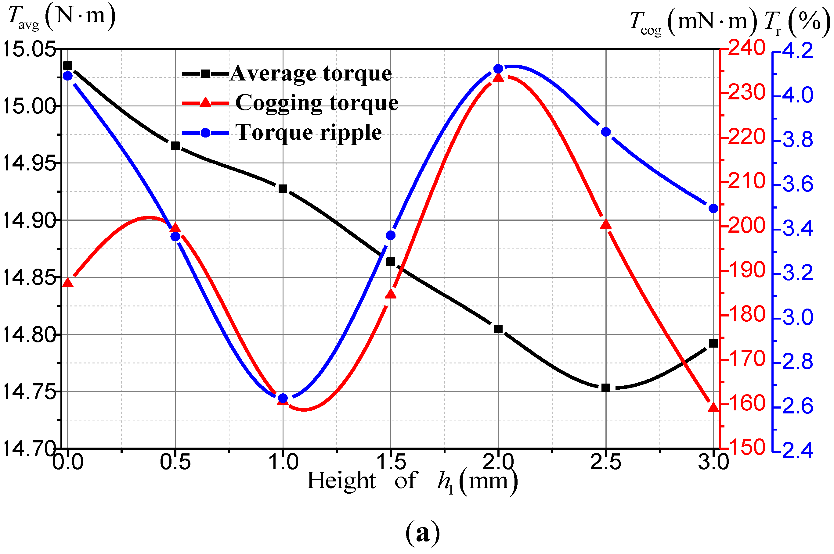 Firstly, changing h1 at an interval of 0.5 mm from 0 mm to 3.0 mm with h2 = 0.2 mm and L = 0.5 mm as shown in Step (1) of Figure 5, the waveforms of electromagnetic torques, cogging torques and torque ripples are shown in Figure 6a. It should be noted that the torque data of point h1 = 0 mm represents the torque data of the initial structure. At the point of h1 = 1.0 mm, both the cogging torque and torque ripple reach their minimum values with the average torque reduced only by 0.72%.