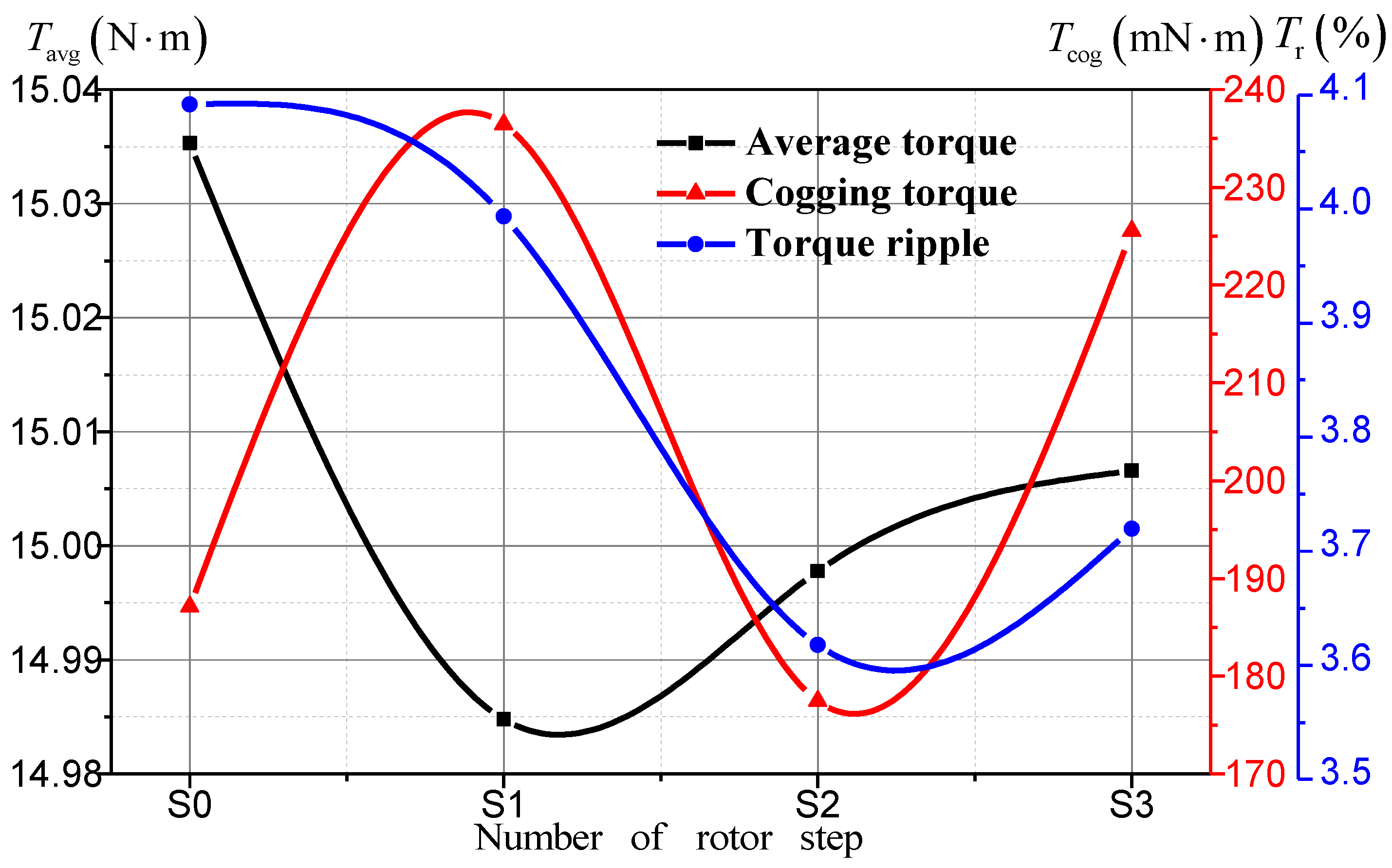 Average torques, torque ripples, cogging torques according to the number of rotor step.