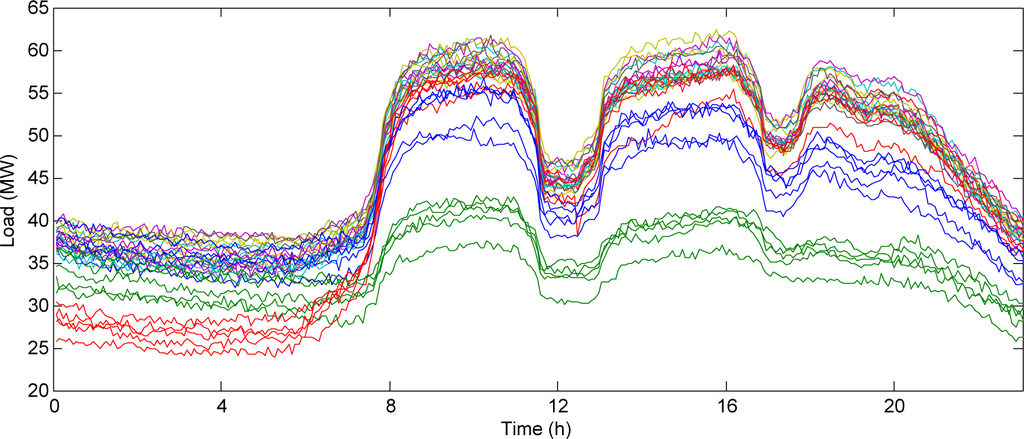The historical load from the Biling Substation in ShenZhen during the entire March in 2014 is shown in Figure 2. The sample interval is 5 min, thus we have 288 samples per day. There are three peaks in the area, i.e., around 10:00, 16:00 and 19:00. The duration of the former two are relatively longer with 2.5 h and 3.5 h, respectively, while the peak hours in the evening only last no more than 2 h. Different colors indicate different days of the week, i.e., from Monday to Sunday.
