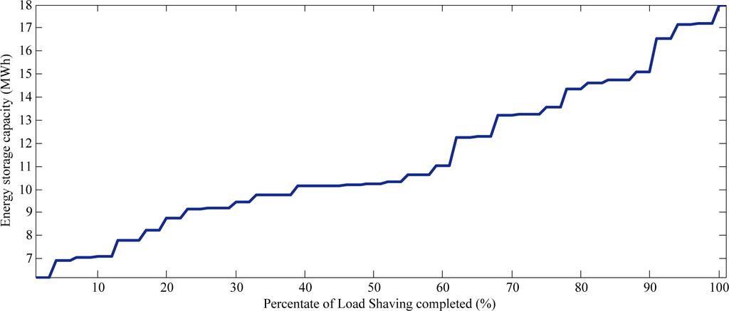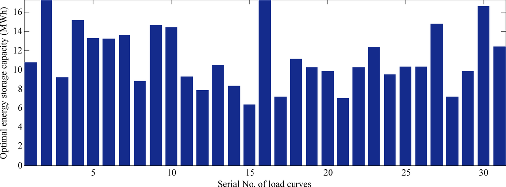 Figure 3 shows the optimal energy capacity to accomplish the tasks of peak load shaving with the power capacity being 4 MW. From the results shown in the figure, we find the energy capacity needed mainly lie in the interval from 8 to 16 MWh, that is, the system keeps discharging for 2–4 h at the maximum discharging power.