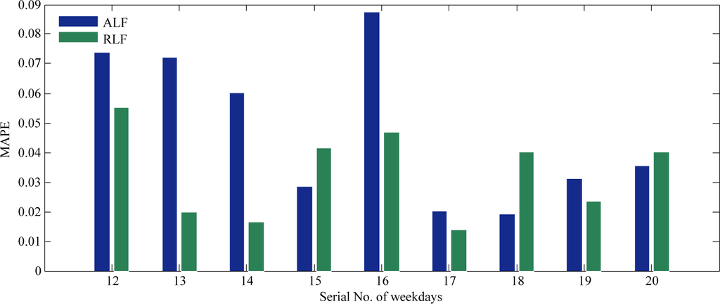 Historical data with m days backward and the known data of the day to predict are necessary for the RLF. In the simulation process, we obtain the load data of the virtual day before the next prediction point, together with the data of the preceding m virtual days, to predict the load of subsequent virtual days. We distinguish weekdays and weekend days regarding their differences in load characteristics by assigning 10 to m for weekdays and 4 for weekend days, so that we have data of the preceding two weeks in both situations. Figure 5 shows the prediction results of nine weekdays (from 18th to 21st and from 24th to 28th of March), with the average MAPEs of ALF and RLF being 4.76% (the average value of values of blue bars) and 3.31% (the average value of values of green bars) respectively. Compared with ALF, the RLF have better performances in terms of accuracy. Similar results are observed in the prediction results of weekend days.