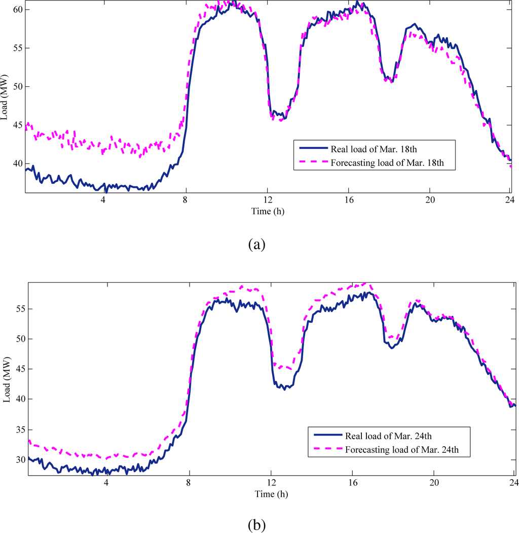 Figure 6 draws a typical curve of real and forecasting load, of the 12th weekday (March 18th) and the 16th weekday (March 24th), the latter of which has higher accuracy as we intentionally selected March 18th as a representative day with high prediction errors so as to construct a stricter criterion to validate the RLF method.