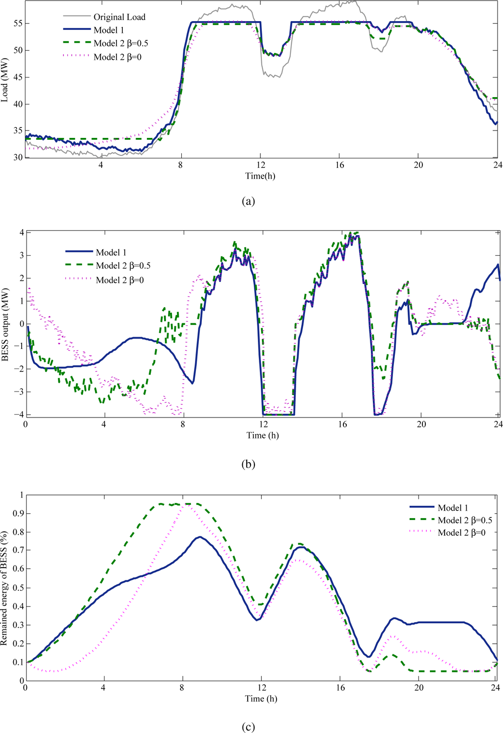 Figure 7c shows the remaining energy under different models. The number of charging and discharging cycles is the least in model 1 since it is only required to accomplish tasks of peak load shaving. On the other hand, model 2 needs more cycles and larger depth of discharge in order to reduce the variance and fluctuation.