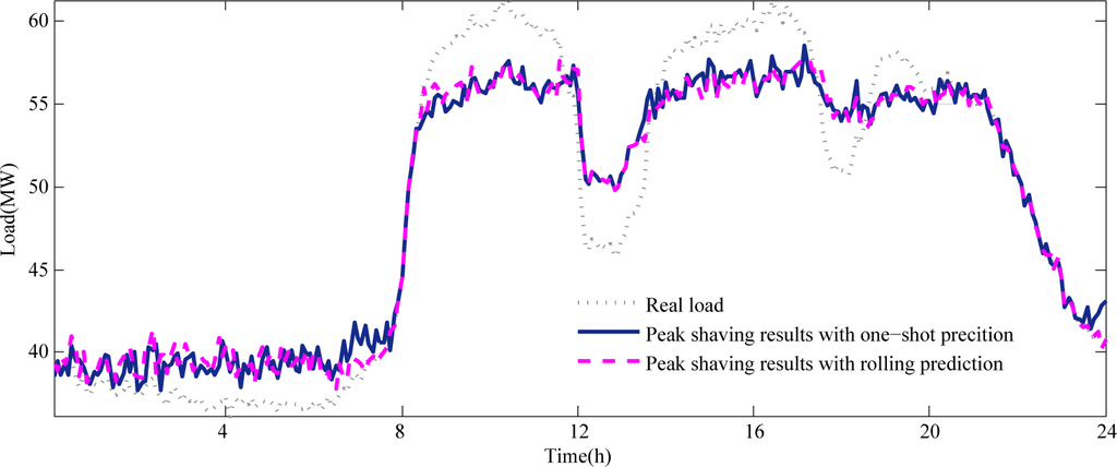 Although there is difference between the predicted load curve and real load curve, the peak load shaving is still effective because the peak hours of both the curves match. As for the one-shot forecasting, the shapes of the predicted curve and that of the real curve differ a lot, especially in the valleys. Compared with one-shot optimization, the RLF method significantly increases the peak load reduction by improving the forecasting accuracy and adjusting the charging and discharging process in real-time.