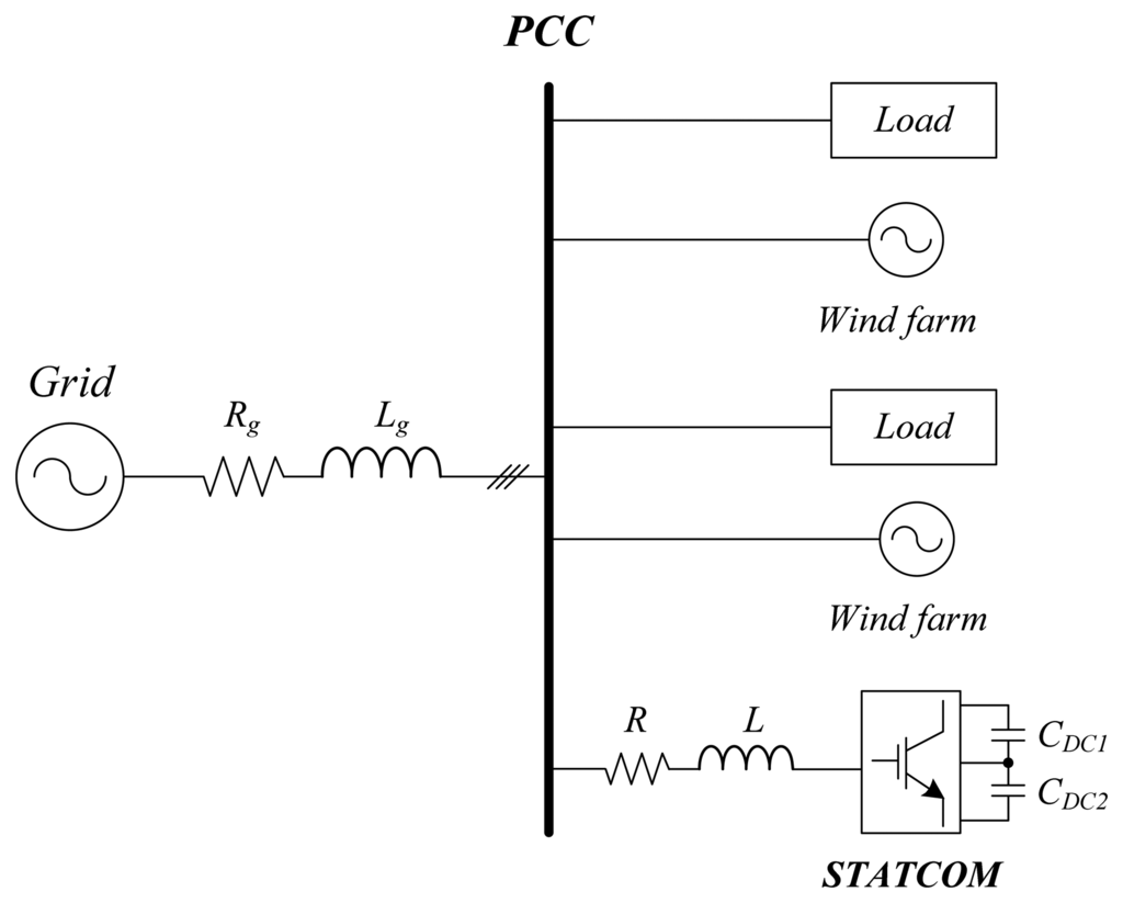 This task can be accomplished by means of a STATCOM, which is a Voltage-Source Converter (VSC) system whose prime function is to exchange reactive power with the host AC system [] and control the power factor. In a distribution system, it is mainly used for voltage regulation []. This has a major application in weak grids, whose significant grid impedance may lead to large PCC voltage variations compared to that of strong grids. The general system under investigation is shown in Figure 1. Several loads and wind farms are connected to the same PCC along with a STATCOM, which is in charge of the PCC voltage regulation. In this figure, L and R are the grid filter parameters, Lg and Rg are the grid impedance parameters, CDC1 and CDC2 are the DC-link capacitors and the STATCOM is a three-level neutral point clamped (NPC) converter.