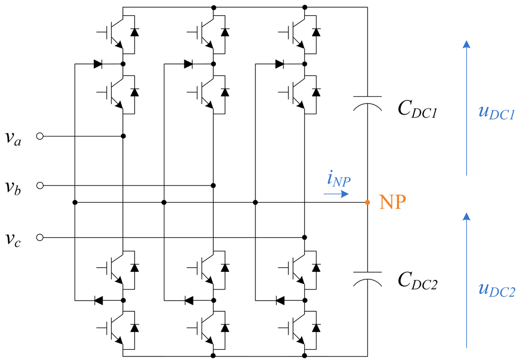 The NPC converter, whose scheme is shown in Figure 10, has some drawbacks such as the additional clamping diodes, a more complicated PWM switching pattern design and possible deviation of neutral point (NP) voltage []. The capacitors can be charged or discharged by neutral current iNP, causing NP voltage deviation. It might appear a ripple of frequency three times the fundamental in uDC1 and uDC2 that can destroy components if both DC-link voltages are not balanced.
