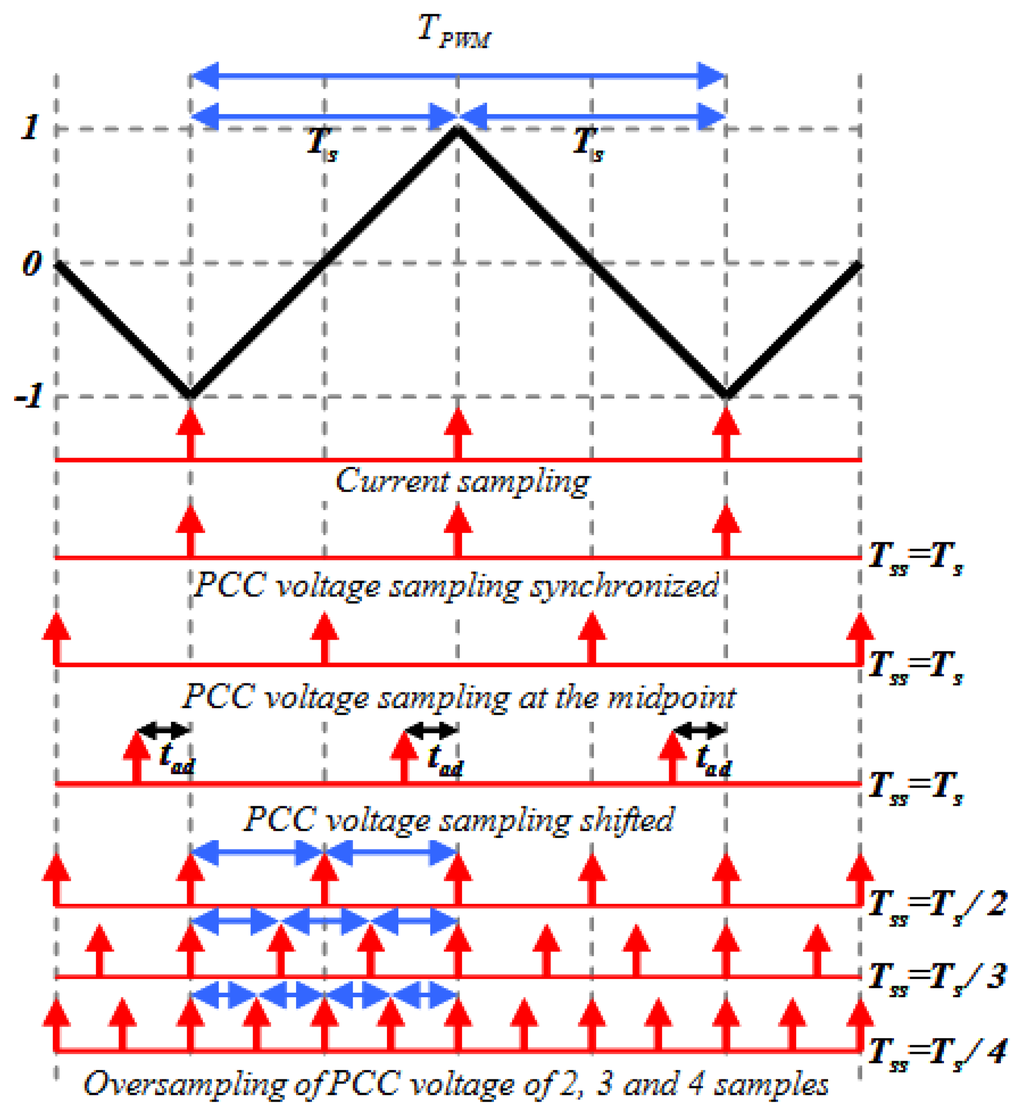 The previously mentioned sampling method synchronized with the current sampling, where the sampling period of the PCC voltage and the timer, Tss, is equal to Ts (Figure 12a);