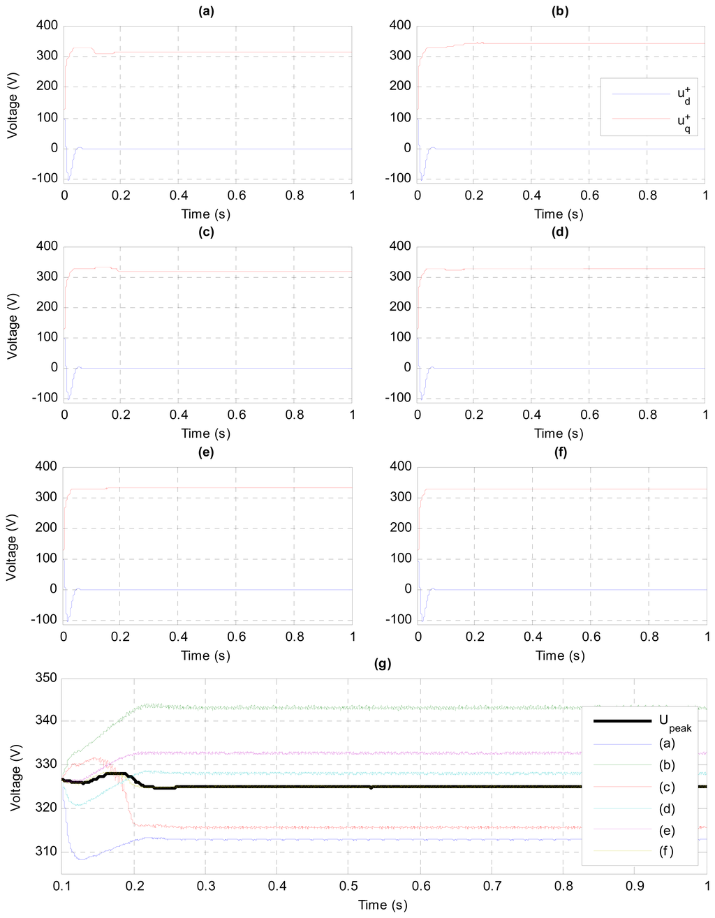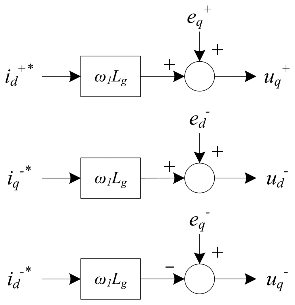 Each of these voltages is separated into its d and q projections: positive sequence voltages and are shown in Equation (3a) and (3b), whereas negative sequence voltages and are shown in Equation (4a) and (4b). These four expressions are steady-state approximations. Grid resistance Rg is considered to be very small, so that its contribution to the PCC voltage can be neglected (compared to the voltage drop across the grid filter inductance). Furthermore, the derivative of a constant signal (such as ι⃗ in dq-axes) is zero. Note that is equal to zero Equation (3a) because a Phase-Locked Loop (PLL) is used to synchronize the positive sequence PCC voltage vector (u⃗+) with the q-axis, hence the projection of u⃗+ on this axis is equal to its amplitude :