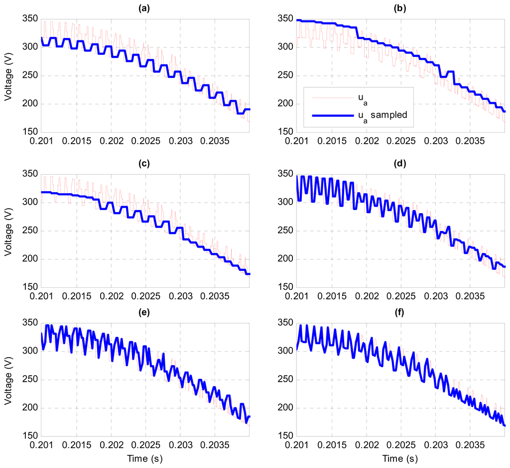 Oversampling of three samples, synchronized with Ts, where Tss = Ts/3 and for which the voltage still remains slightly erroneous (Figure 12e), and